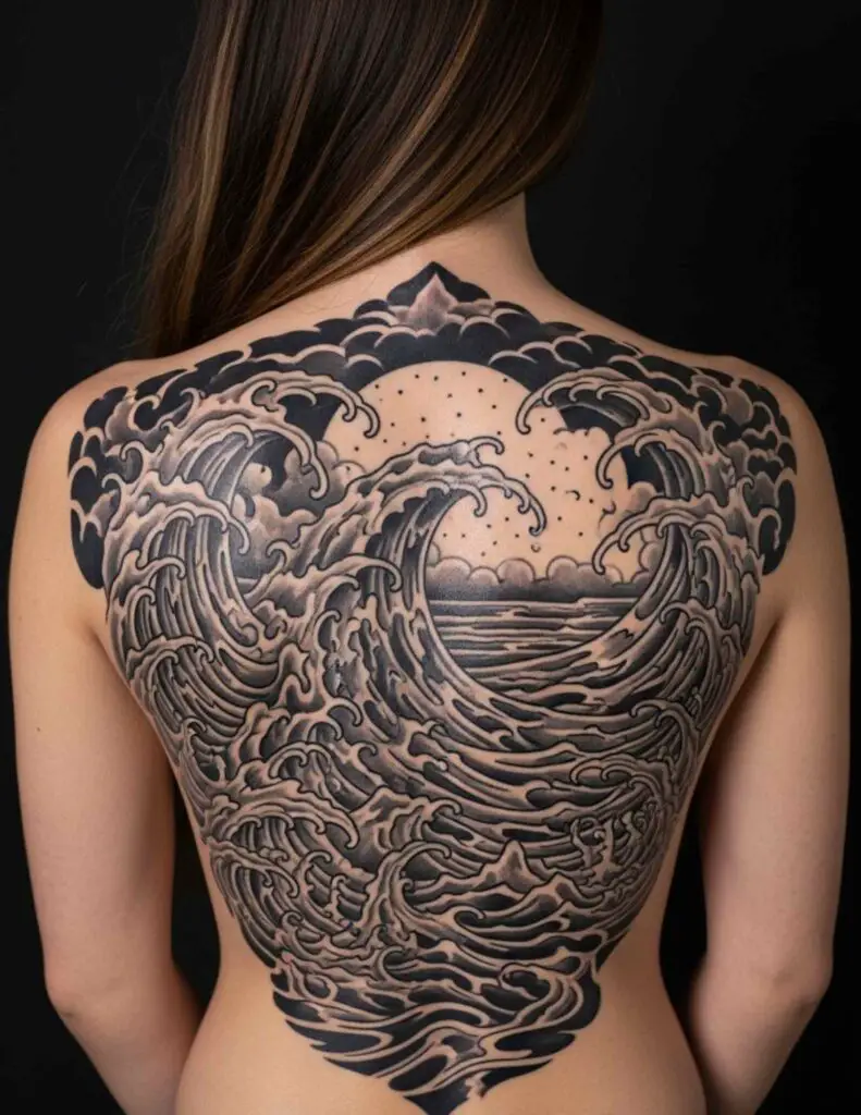 The traditional Japanese back piece, or Horimono, is considered the pinnacle of Japanese tattooing. A central figure, typically a goddess, dragon, or mythological creature, surrounded by waves, clouds, peonies, and wind bars. The formal compositional rules of irezumi are specifically designed for the back. This is a life’s work piece done by a specialist.