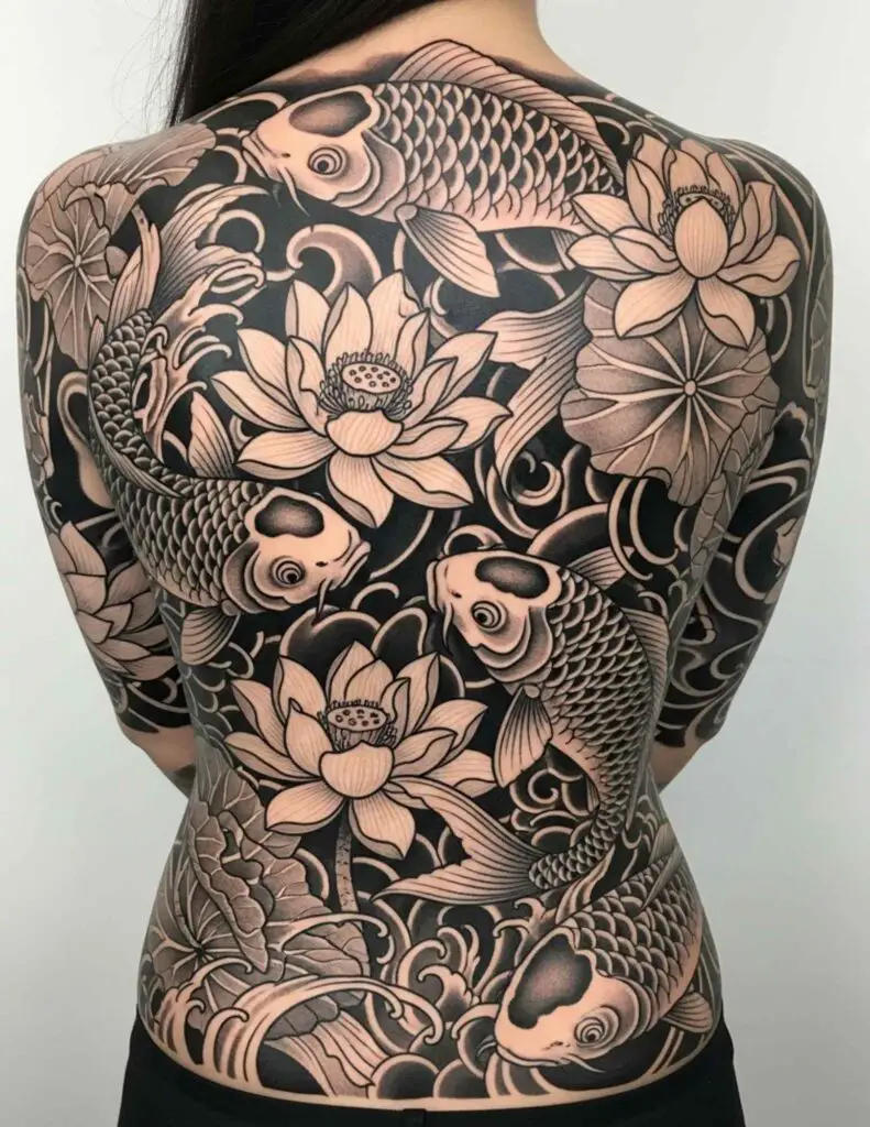 Two or more koi fish swimming among lotus flowers, waves, and botanical elements. The koi’s symbolism of perseverance and transformation, the lotus’s symbolism of growth through difficulty. In Japanese style or detailed colour realism, this is one of the most satisfying back piece compositions.