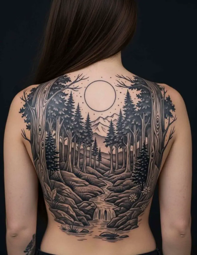 A dense forest at the lower back, the trees thinning as they approach the shoulders, giving way to sky with stars, a moon, or a galaxy above. The landscape travels up the back. The perspective is ground-level, looking up. In black and grey, the depth of the forest is rendered in shadow and fine detail.
