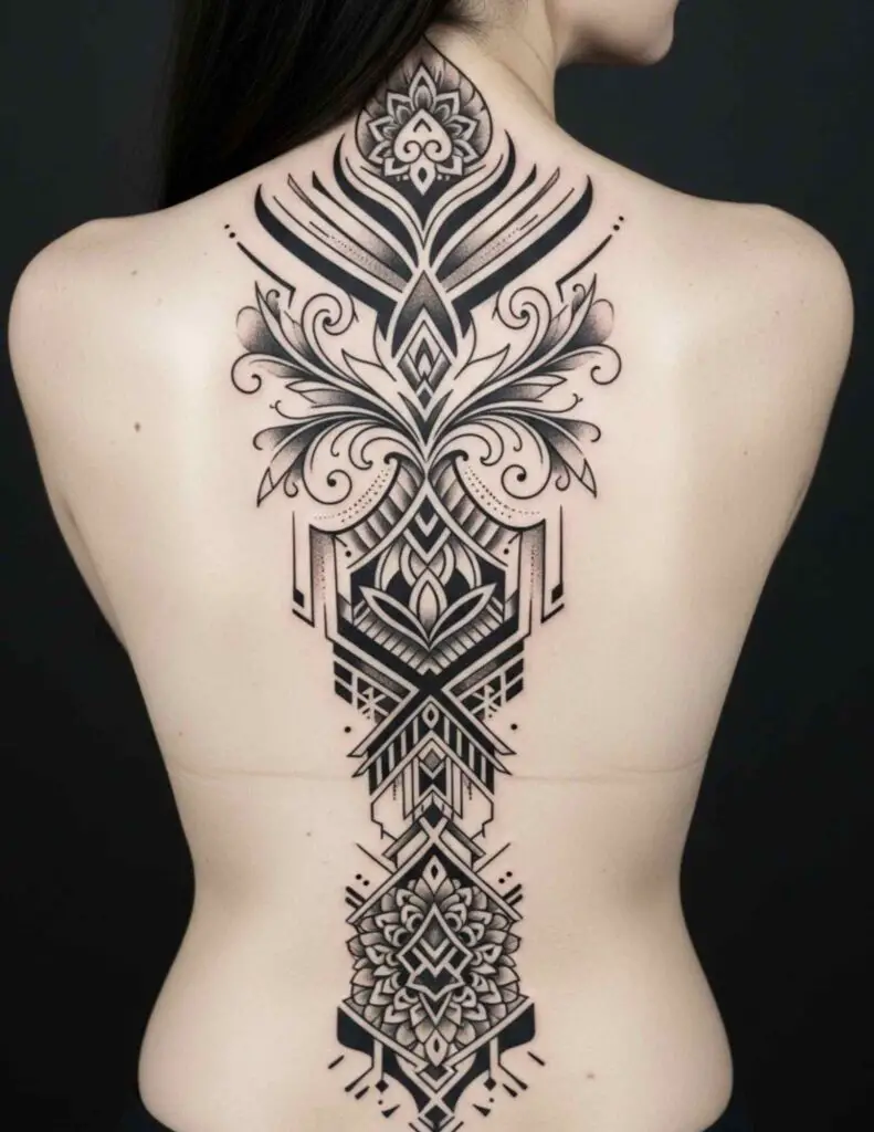 A design that runs the length of the spine, flanked by symmetrical elements spreading outward. The spine as the central axis of the piece. Lotus, tree, sword, or abstract forms. The vertical structure uses the body’s own architecture as the design’s foundation.