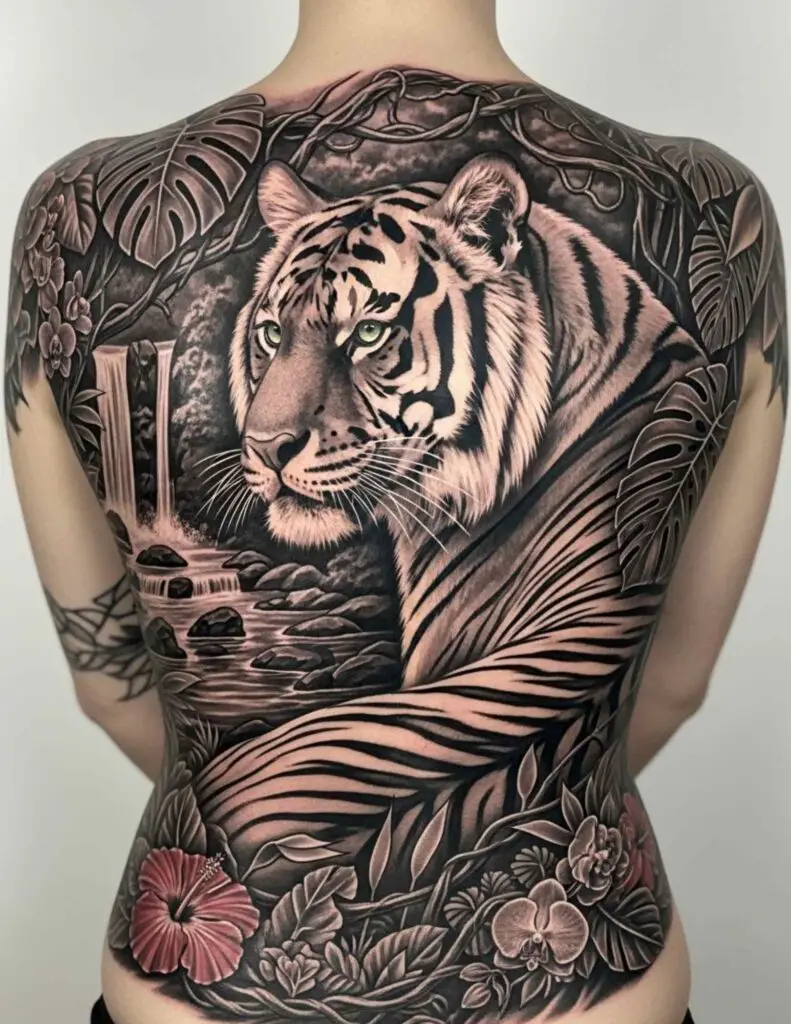 A tiger emerging from dense vegetation, the jungle wrapping around the shoulders and narrowing toward the lower back. The tiger’s face at the centre of the upper back creates a design with real presence. In colour or black and grey, the contrast between the tiger’s form and the surrounding foliage is powerful.