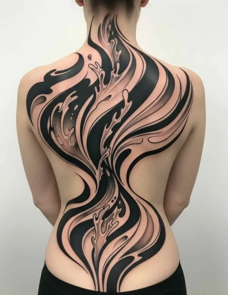 Not a representational image. Flowing abstract forms that trace the curves and contours of the back, expanding with the shoulder blades and following the spine’s natural line. The design shapes itself to the body rather than sitting on it. This requires a genuinely skilled artist who works with the body’s specific form. When done well, it is unlike anything else.