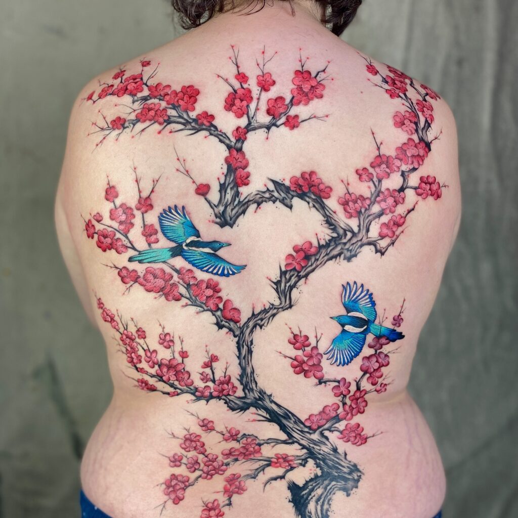A single tree with roots spreading into the lower back and branches reaching to the shoulders, covered in blossom. Cherry or wisteria are the most popular choices. The vertical axis of the tree works perfectly with the back’s proportions. In fine line or watercolour, the result is breathtaking.