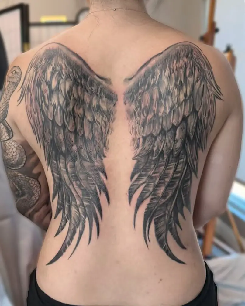 A full-scale angel with wings spread from shoulder to shoulder. The wingspan can fill the upper back entirely while the figure extends down to the lower back. In black and grey realism or in a more illustrative style, the scale and symmetry of this piece on the back are extraordinary.