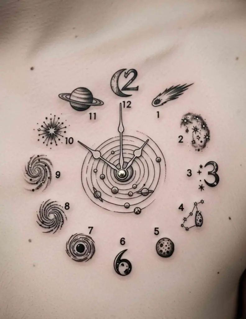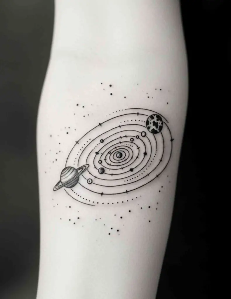 A miniaturised solar system with the sun at centre and the planets in their orbital positions, rendered in fine line on the inner forearm or wrist. Compact enough to be subtle, specific enough to be genuinely interesting. The scale inversion of containing the solar system in a small area of skin is part of the point.