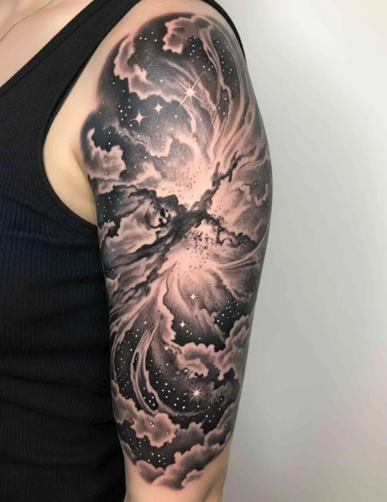 A nebula, the cloud of gas and dust where stars are born, filling the shoulder and upper arm. The Orion Nebula, the Eagle Nebula, or an abstract nebula in vivid pinks, purples, and blues. The soft edges of nebular gas suit a watercolour or airbrushed technique.
