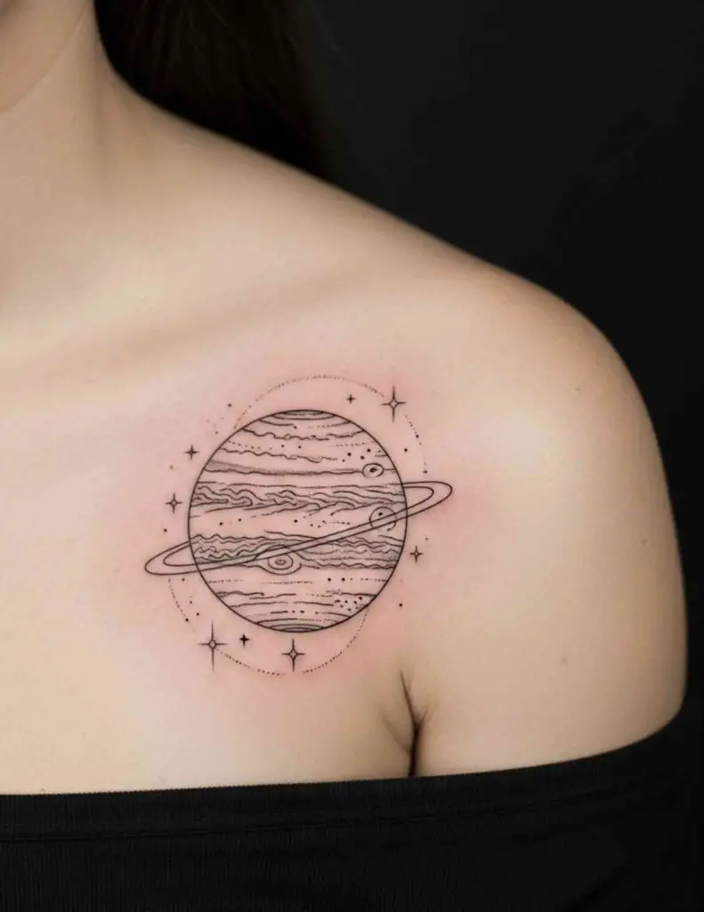 A single planet rendered in precise fine line. Saturn with its rings. Jupiter with its bands and storm eye. The precision of astronomical illustration applied to tattoo art. Detailed, specific, and unusual in a field often dominated by loose, atmospheric approaches.