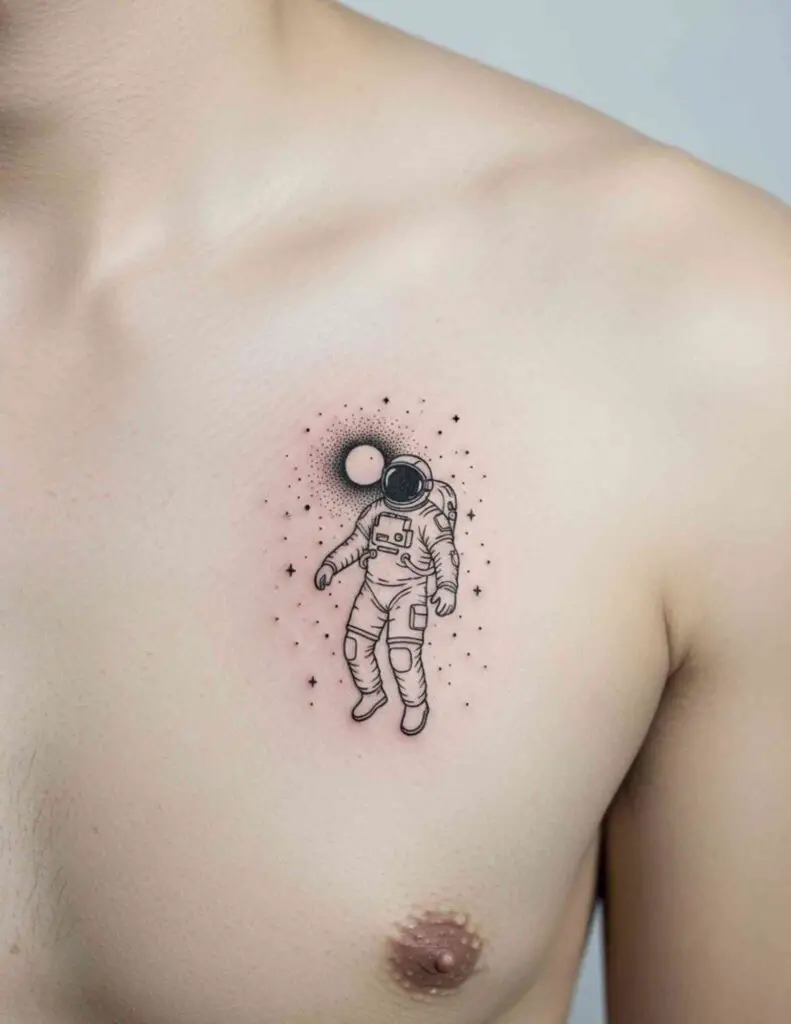 A small figure in a space suit floating in a field of stars and nebular colour. The contrast between the tiny human figure and the vast surrounding cosmos says something specific about scale and solitude. Small figure, enormous context. The tattoo works as a meditation on human smallness.