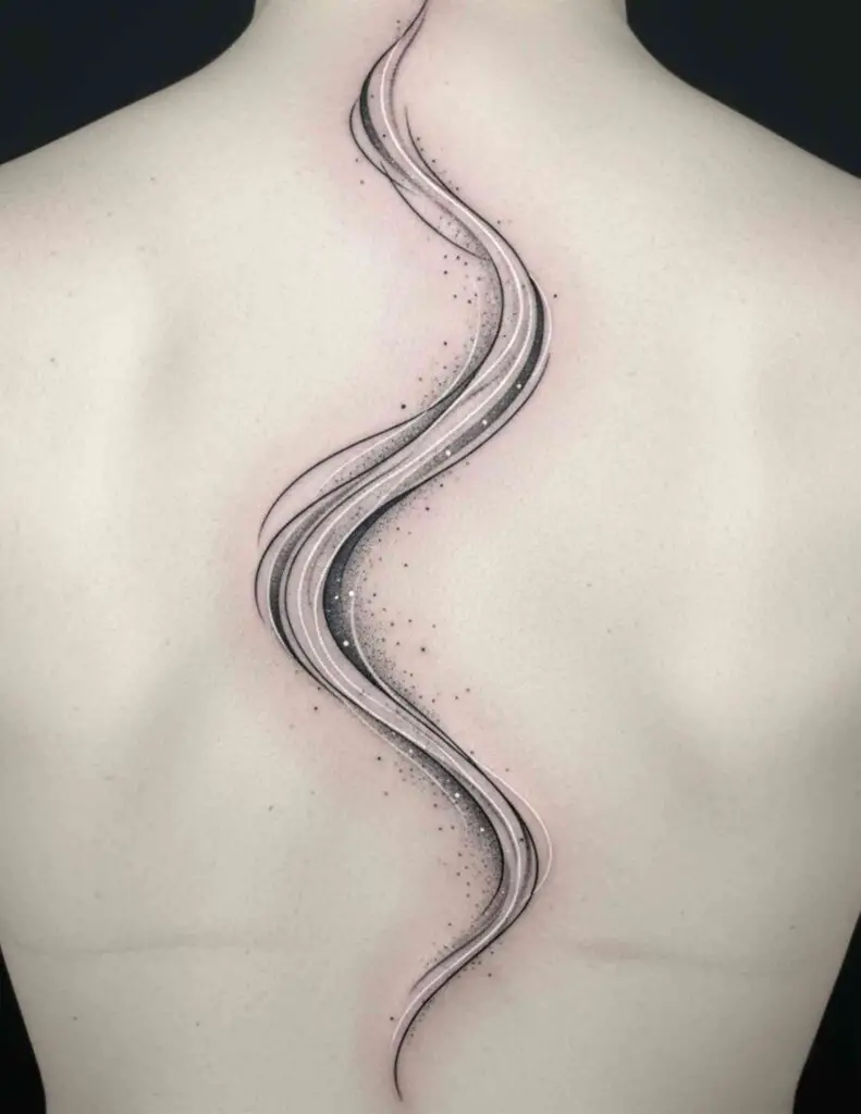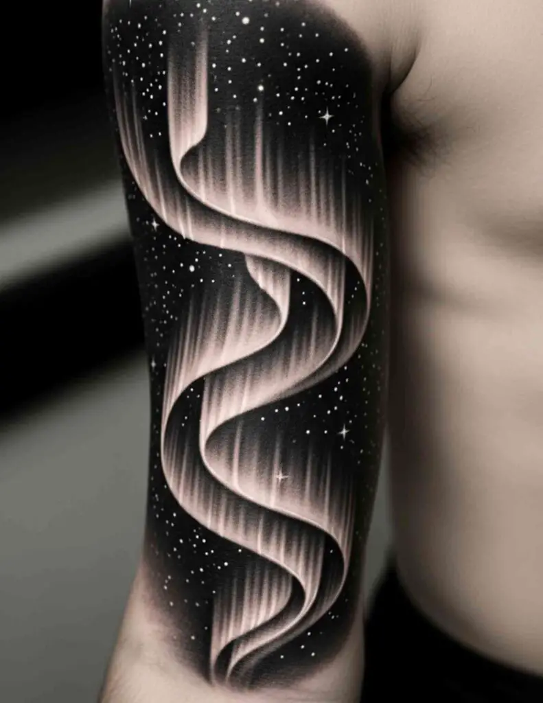 The northern or southern lights rippling across a dark sky filled with stars. The aurora’s shifting greens, blues, and purples produce one of the most striking colour tattoo subjects available. The atmospheric quality of the aurora suits a loose, blended technique.