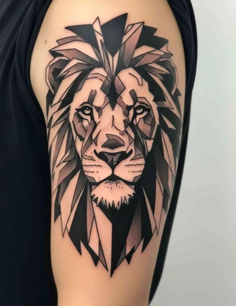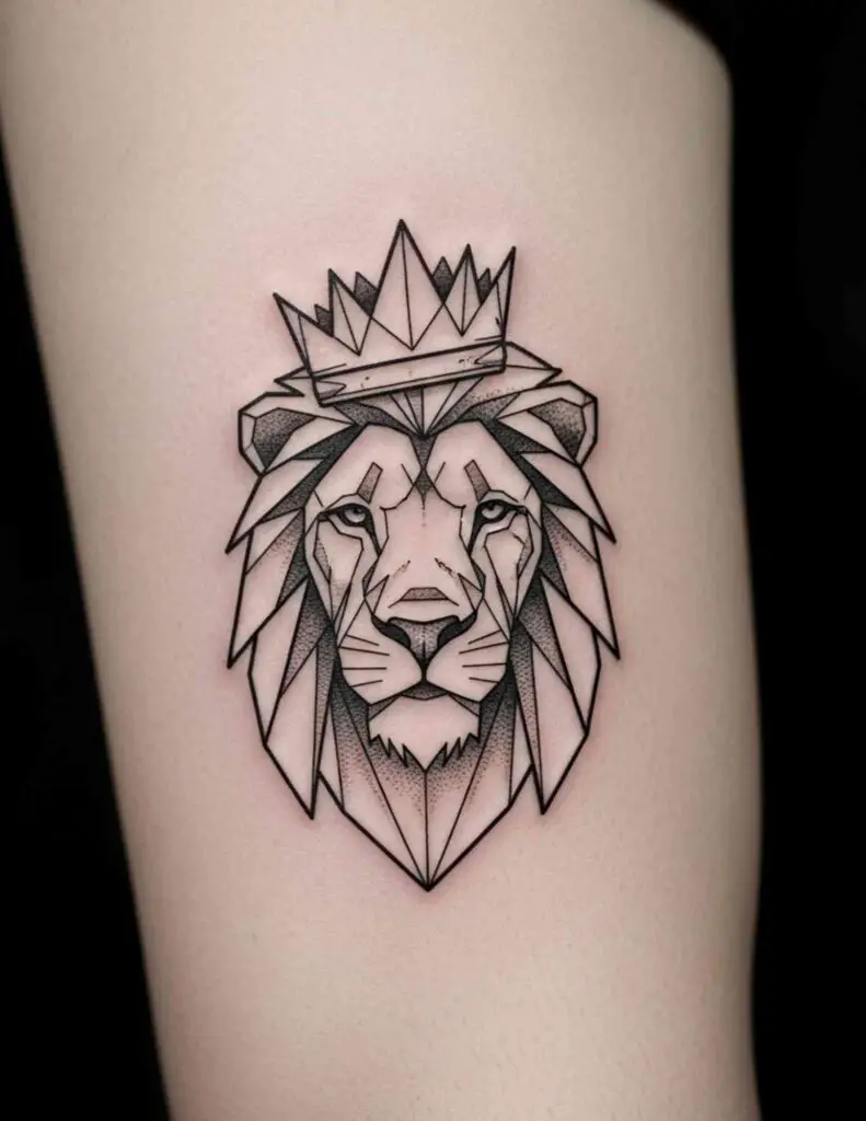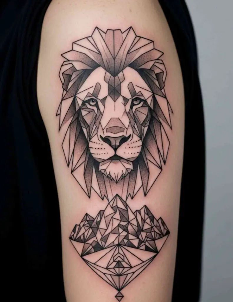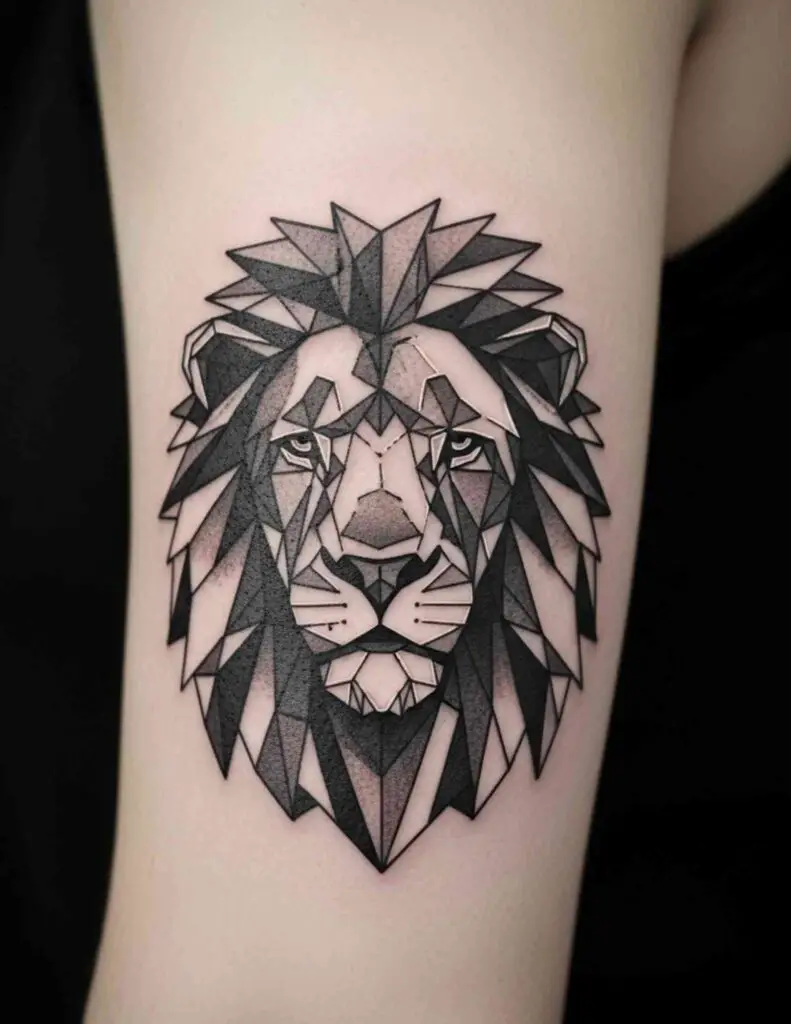 The geometric approach strips away the organic softness of fur and muscle and replaces it with planes and angles. The result is a lion that looks constructed, mathematical, almost architectural. Rather than diminishing the animal’s power, the geometric treatment seems to intensify it: this is not a creature of instinct but of absolute precision. The combination suits anyone who wants their lion tattoo to say something about controlled, deliberate strength rather than wild force.