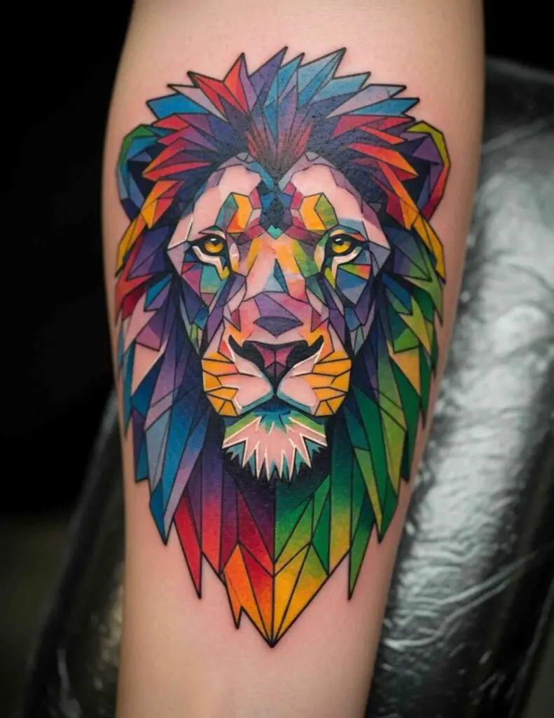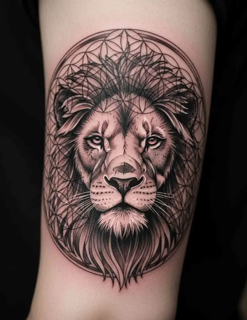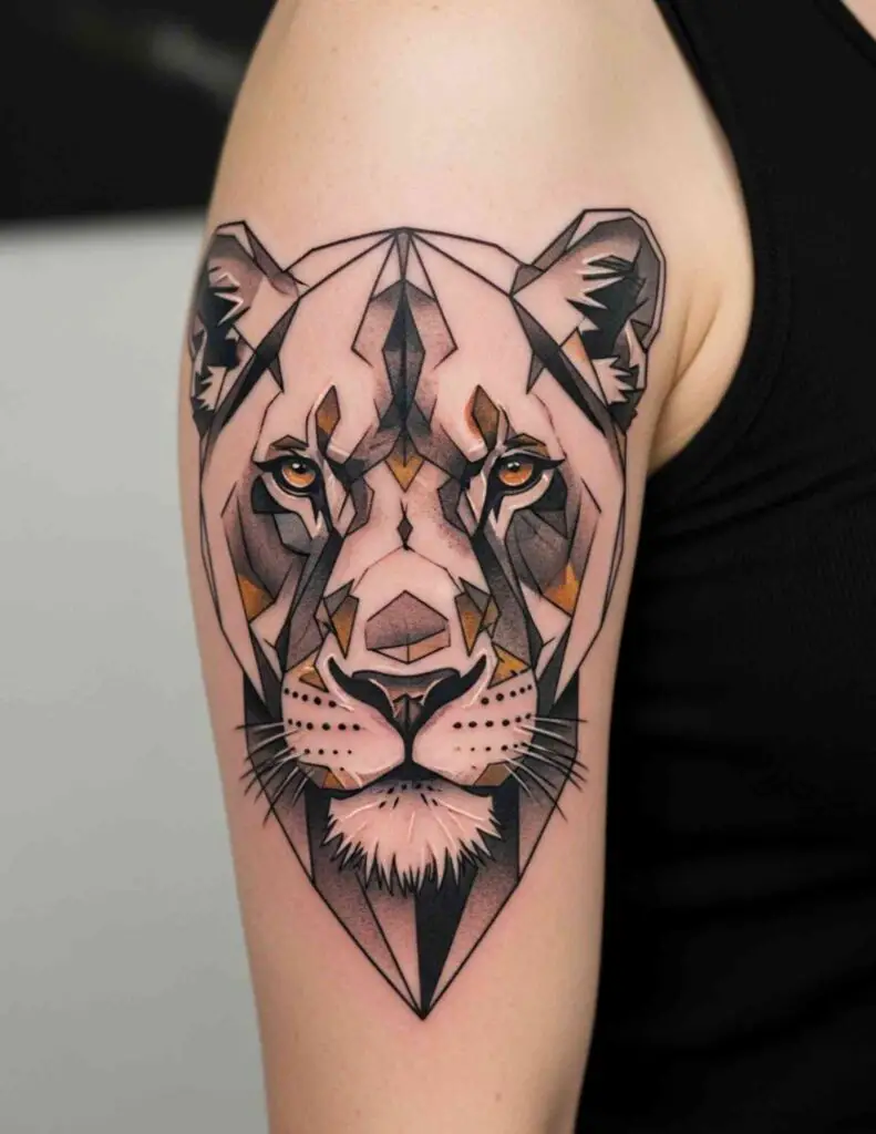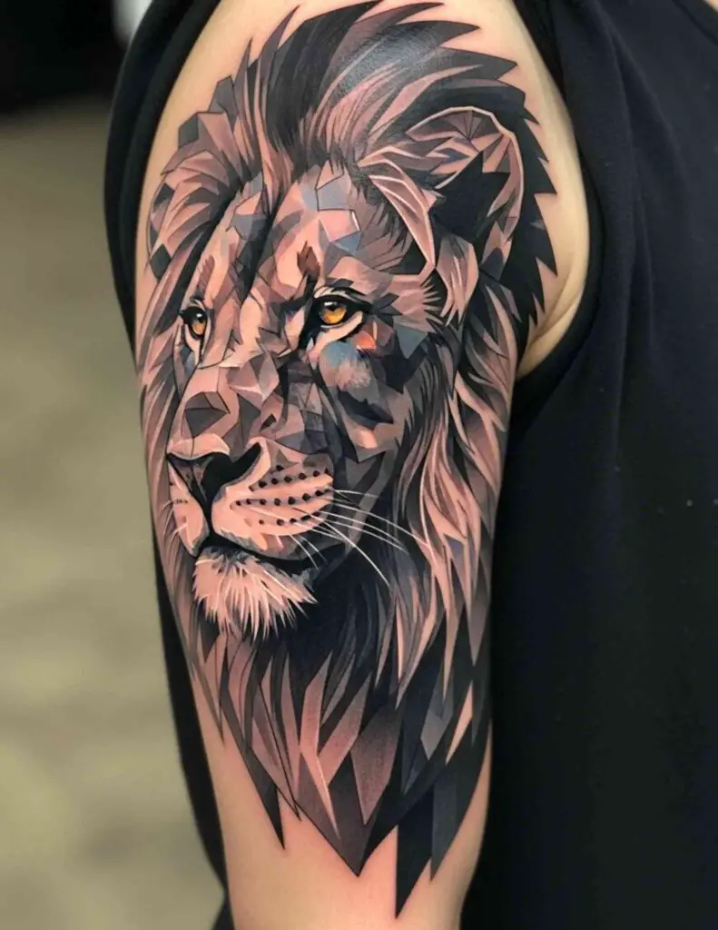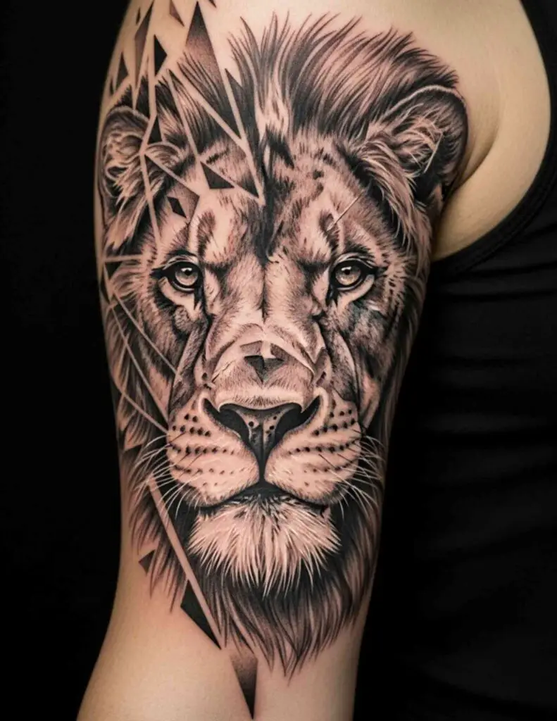 The geometric approach strips away the organic softness of fur and muscle and replaces it with planes and angles. The result is a lion that looks constructed, mathematical, almost architectural. Rather than diminishing the animal’s power, the geometric treatment seems to intensify it: this is not a creature of instinct but of absolute precision. The combination suits anyone who wants their lion tattoo to say something about controlled, deliberate strength rather than wild force.
