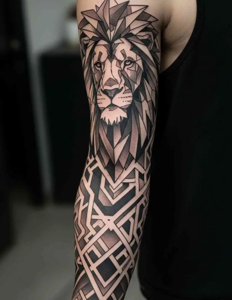 A geometric lion head as the focal point of a larger geometric sleeve, with geometric patterns flowing outward from the face to fill the arm. The lion grounds the abstract geometry with a recognisable subject. The sleeve becomes a unified composition rather than a collection of separate elements.