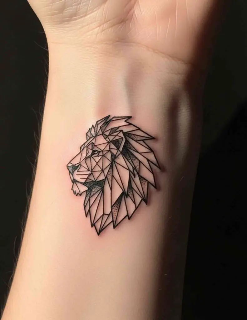 A small geometric lion at wrist or inner forearm scale. The geometric style actually suits miniaturisation better than realistic styles because the angular planes remain readable at small sizes where organic detail would blur. A micro geometric lion done by a specialist in small work is extraordinary.