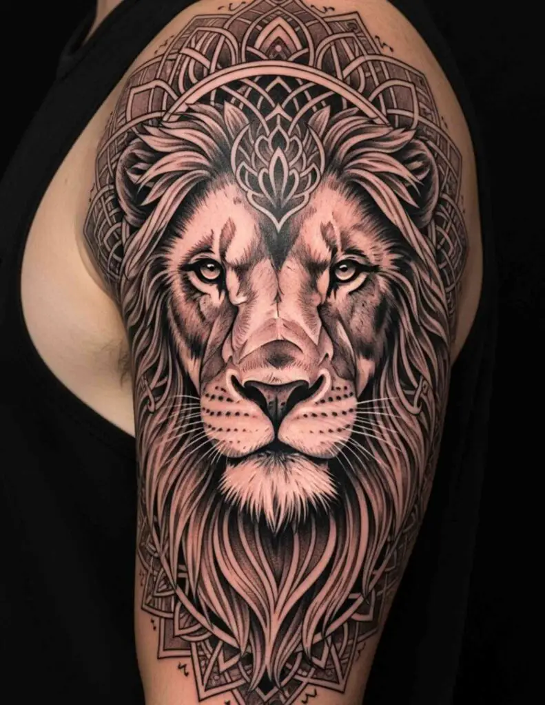 A lion’s face at the centre of a circular mandala, the mandala’s radial pattern forming the mane and surrounding context. The mandala’s precision and the lion’s presence create a design that is both meditative and powerful. Popular for a reason: the combination is genuinely effective.