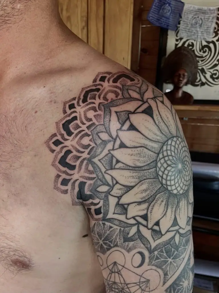 A large circular mandala filling the shoulder cap. The radial symmetry of mandala geometry works perfectly with the rounded shoulder. Bold, high-impact, and the kind of piece that genuinely improves with scale.