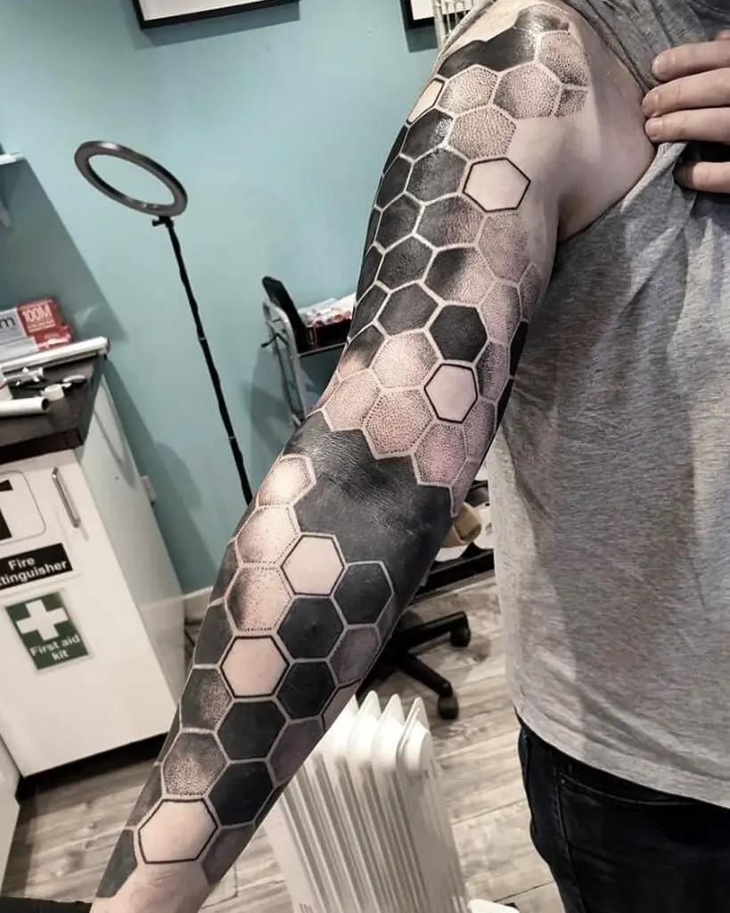A full sleeve built from repeating geometric elements in solid black. No grey wash, no colour. The contrast between black ink and skin does the work. This style ages exceptionally well and the bold lines hold their crispness for years.