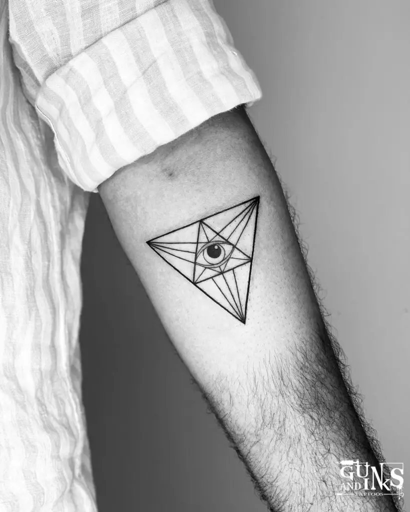 An eye set within a precise equilateral triangle, radiating geometric lines outward. One of the oldest symbolic combinations in esoteric tradition. As a tattoo it is clean, symbolic, and when executed with precise linework, genuinely striking rather than clichéd.