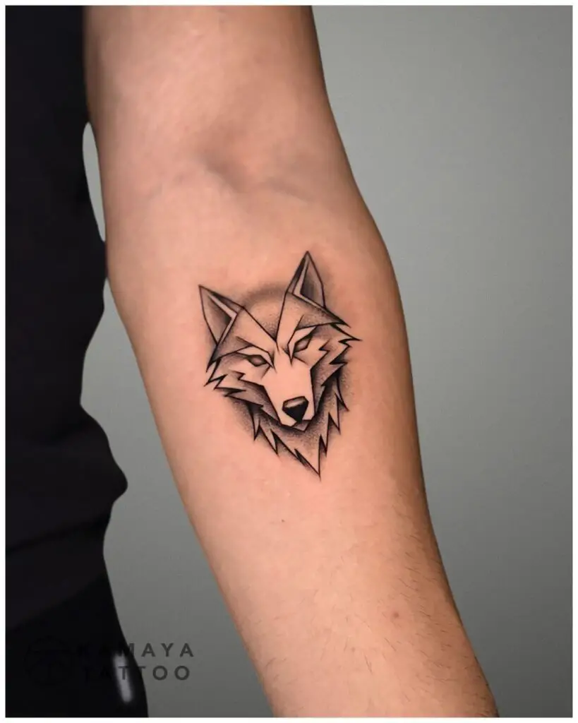 A wolf’s face constructed entirely from triangles and sharp-edged planes. No curves, no softness. The angularity makes the animal look almost architectural. Popular for a reason: the combination of predator symbolism and geometric precision hits a particular note very well.