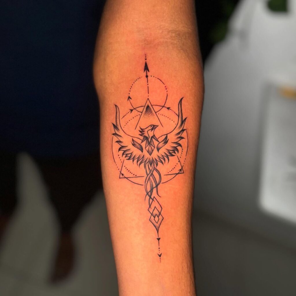 A phoenix rising from stylised flames, both bird and fire rendered in sharp angular geometry. The phoenix carries the most direct symbolism available: death, rebirth, transformation. The geometric style makes that statement with force rather than sentiment.
