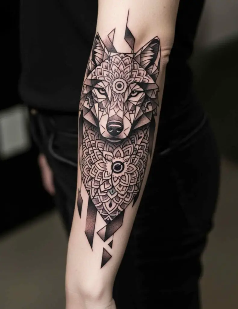 A geometric wolf head on the inner or outer forearm, the angular planes suited to the arm’s flat surface. The forearm placement makes the wolf visible in daily life: looking down at your arm as you work, the wolf’s gaze returning yours.