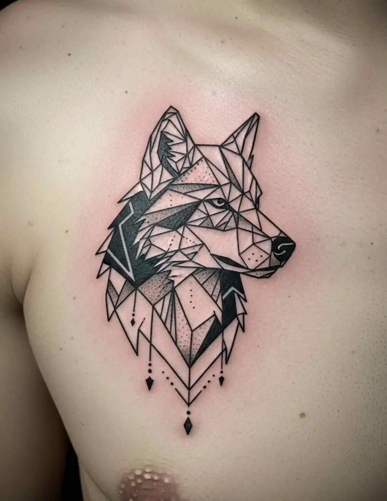 A geometric wolf centred on the chest, the angular planes filling the sternum area with geometric precision. The chest placement gives the wolf a confrontational, totemic quality. The wolf facing outward from the chest with geometric authority.