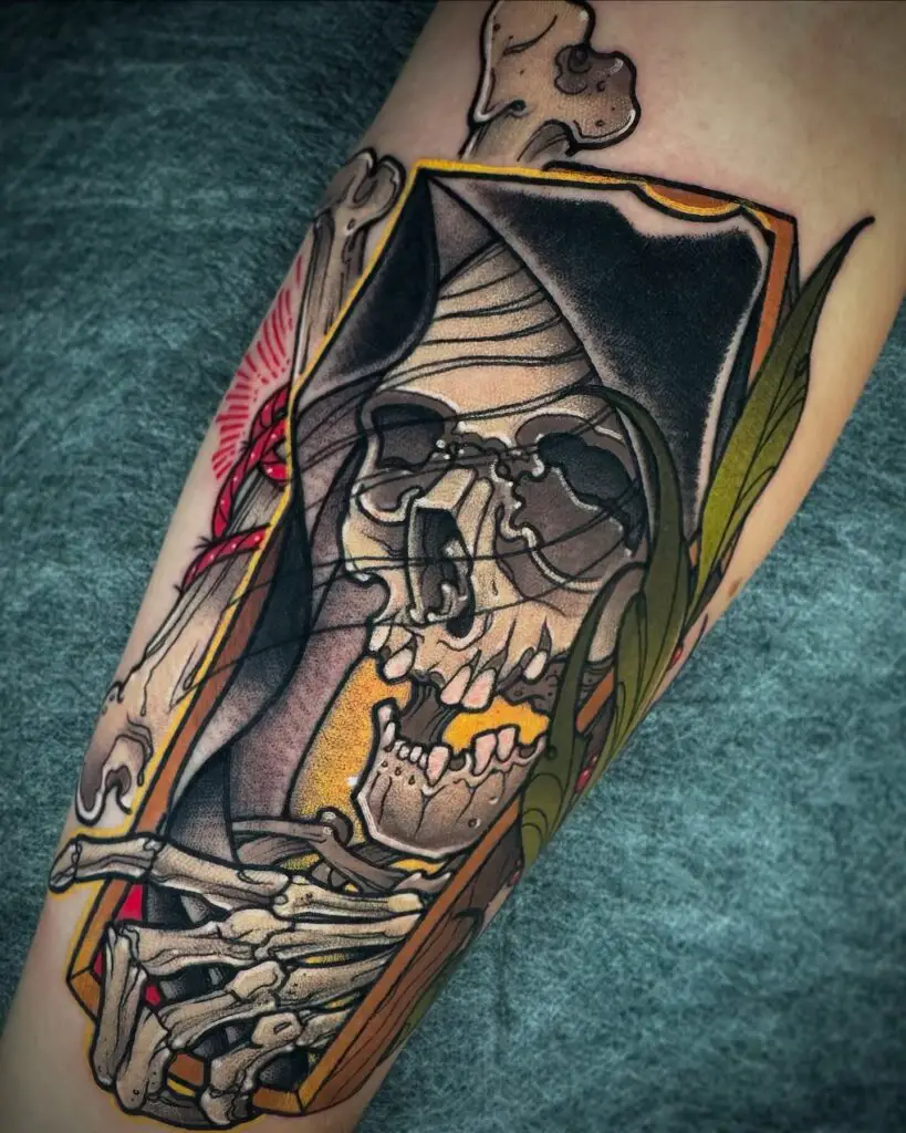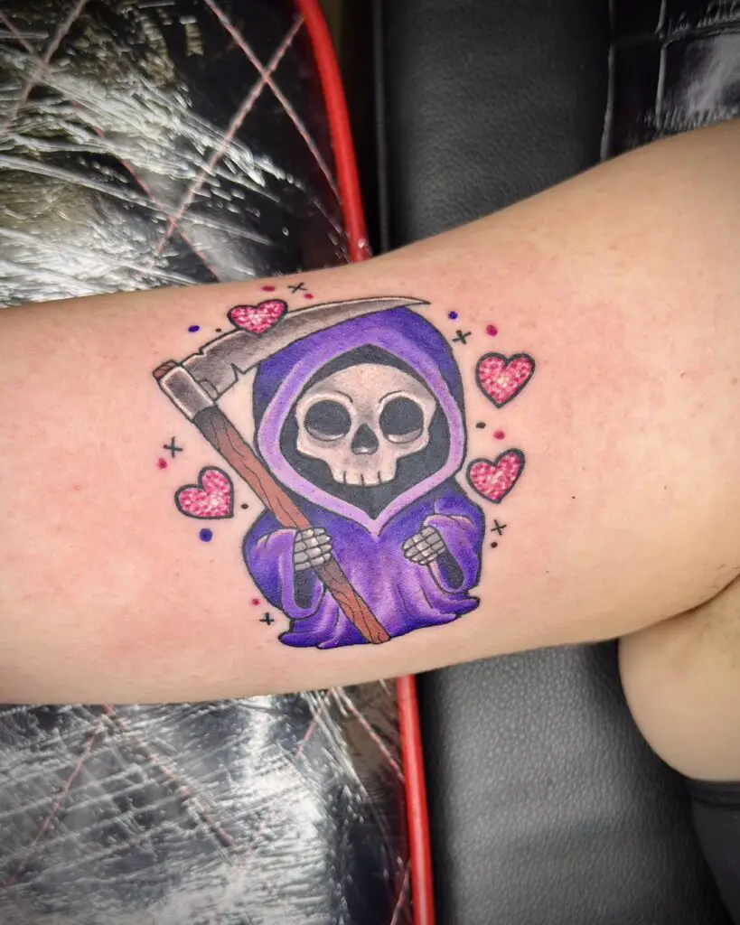The Grim Reaper is not the villain of the story. The Reaper is the fact of the story: that it ends, that time is finite, and that this finitude is what gives each moment its weight. The skeleton in the hooded cloak carrying the scythe is one of the oldest and most consistent symbols in Western visual culture, appearing in medieval art, Renaissance painting, and the broadest traditions of tattooing for the same reason: the acknowledgement of mortality is one of the most honest things a person can carry.