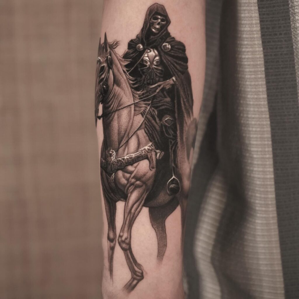 The Grim Reaper as one of the Four Horsemen of the Apocalypse, mounted on a pale horse. The Revelation imagery gives the Reaper a specifically biblical context and a compositional scale that suits back pieces and large upper arm work. The horse and Reaper together create an image of approach: the figure coming rather than arrived.
