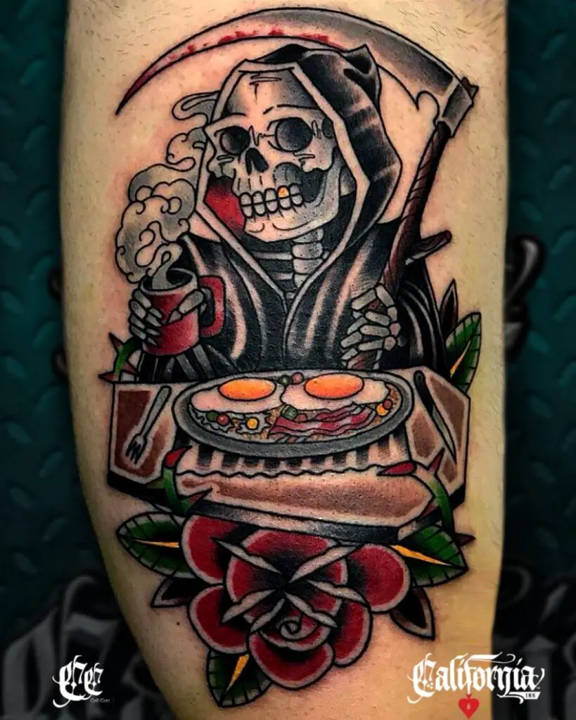 The Grim Reaper with a rose, the ultimate symbol of life and beauty in the hands of the symbol of death. The Reaper and rose is one of the most established pairings in traditional tattooing: the contrast between the two subjects says everything that needs to be said about the relationship between beauty and mortality.