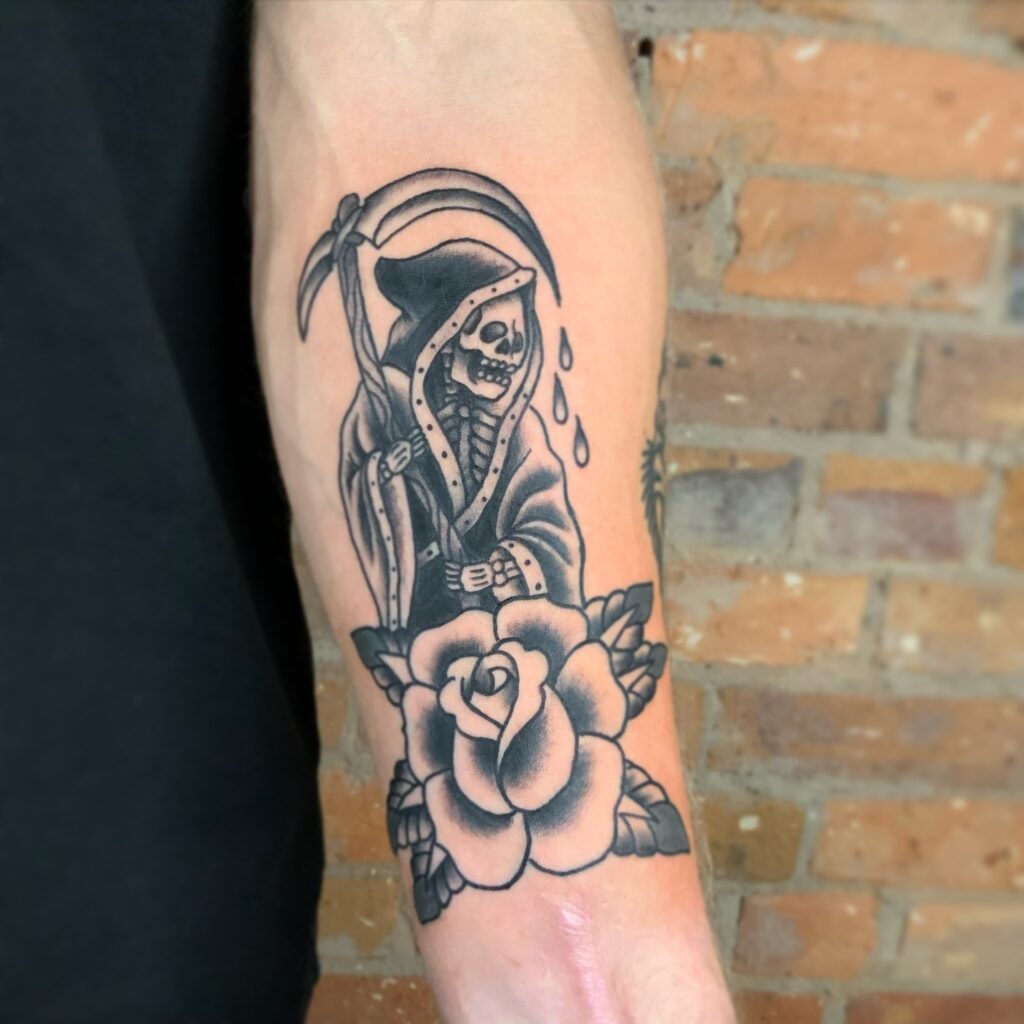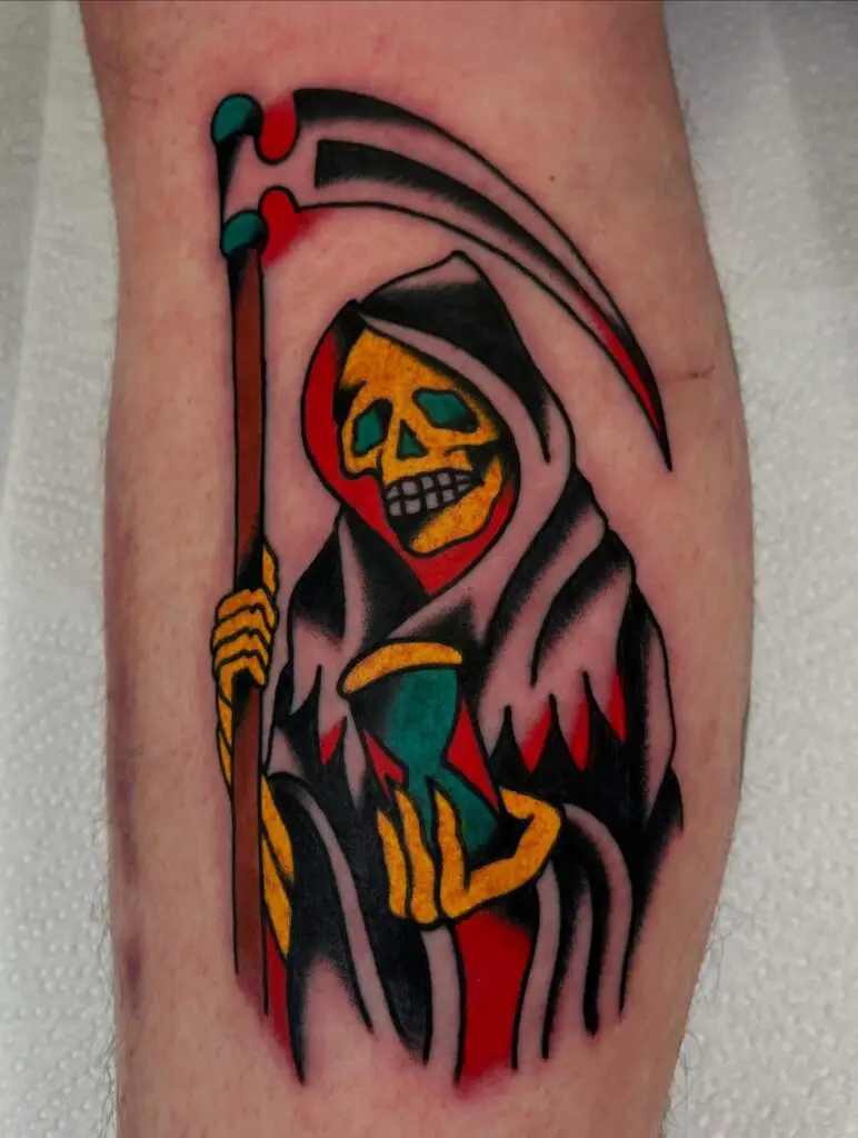 The Grim Reaper in American traditional style: bold black outlines, the hooded figure with scythe, rendered in the graphic confidence of the tradition. The traditional Reaper has been tattooed since the early days of American tattooing and carries the full cultural weight of the style. Bold, clear, and built to last.
