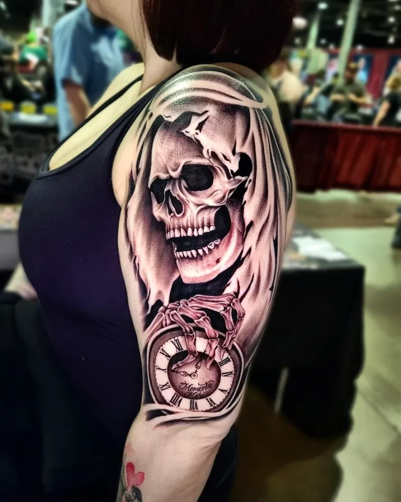The Grim Reaper as the central figure of a full sleeve, with memento mori elements building through the composition: skulls, hourglasses, clocks, roses, crows. The sleeve format allows the full symbolic vocabulary of the Reaper tradition to develop across the arm’s length.