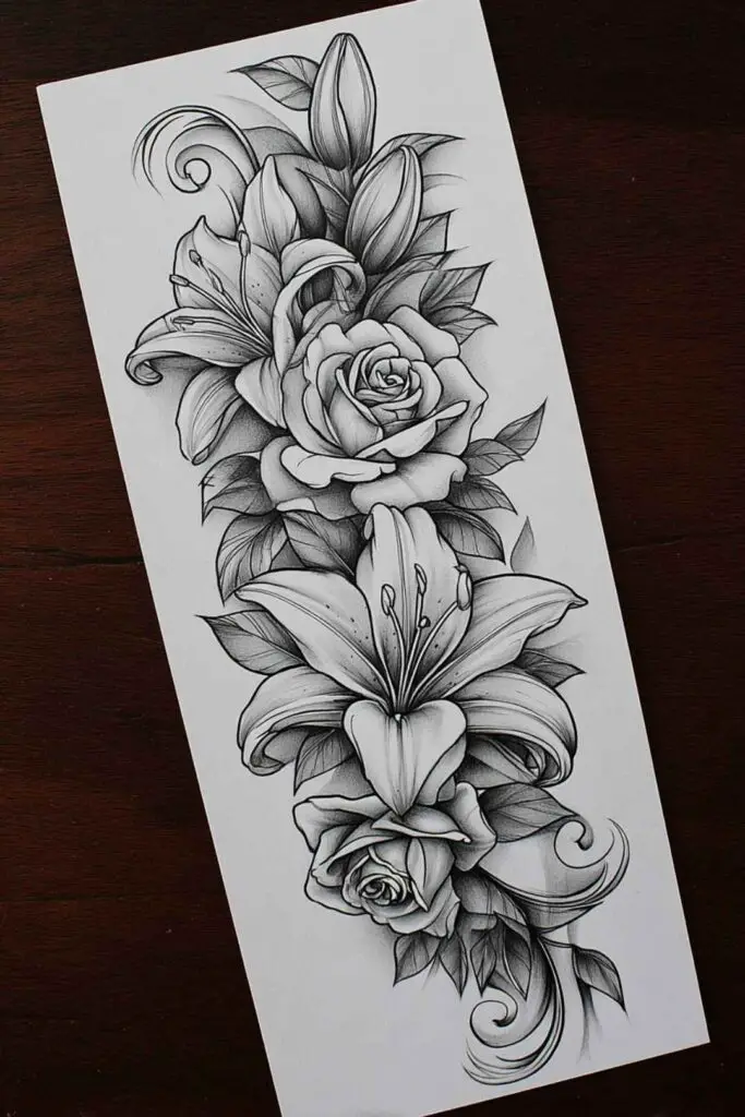 A floral half sleeve tattoo featuring roses, lilies, and swirling leaves creates a beautifully harmonious design full of natural elegance and grace. The bold, classic petals of the roses bring depth and romance to the composition, while the lilies add a touch of purity and delicate refinement.