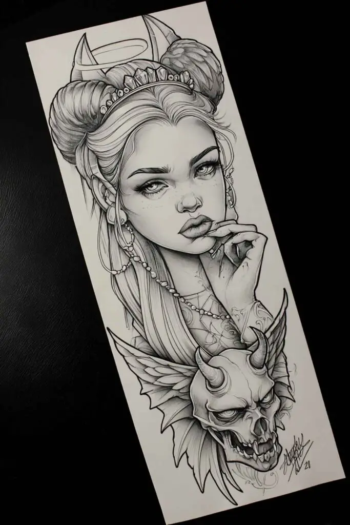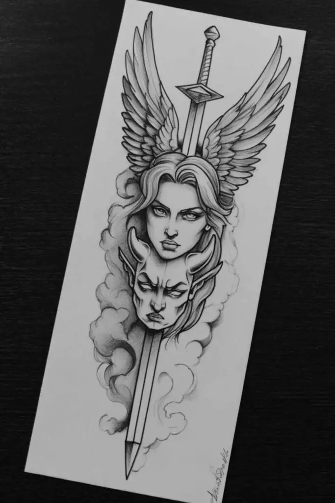 An angelic versus demonic half sleeve tattoo split down the arm creates a striking visual contrast that explores themes of duality and inner conflict. One side of the arm is adorned with soft, ethereal imagery—glowing halos, delicate wings, and serene facial features—embodying purity and light.