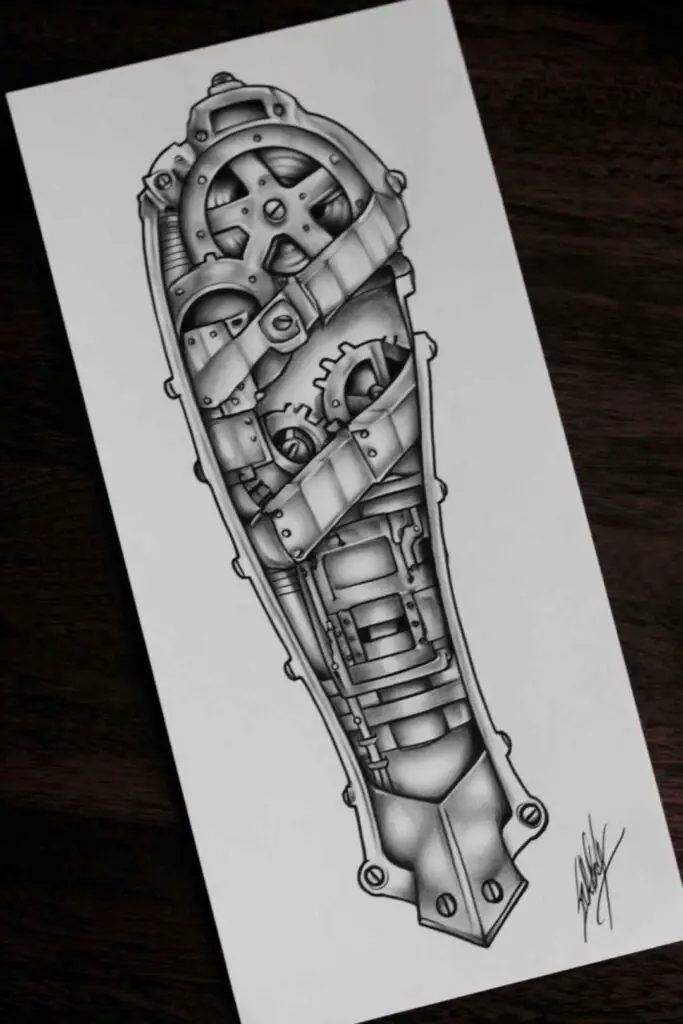 Drawing this tattoo requires careful attention to shading and highlights to mimic the reflective surfaces of metal, creating a three-dimensional effect that gives the arm a striking, mechanical life.