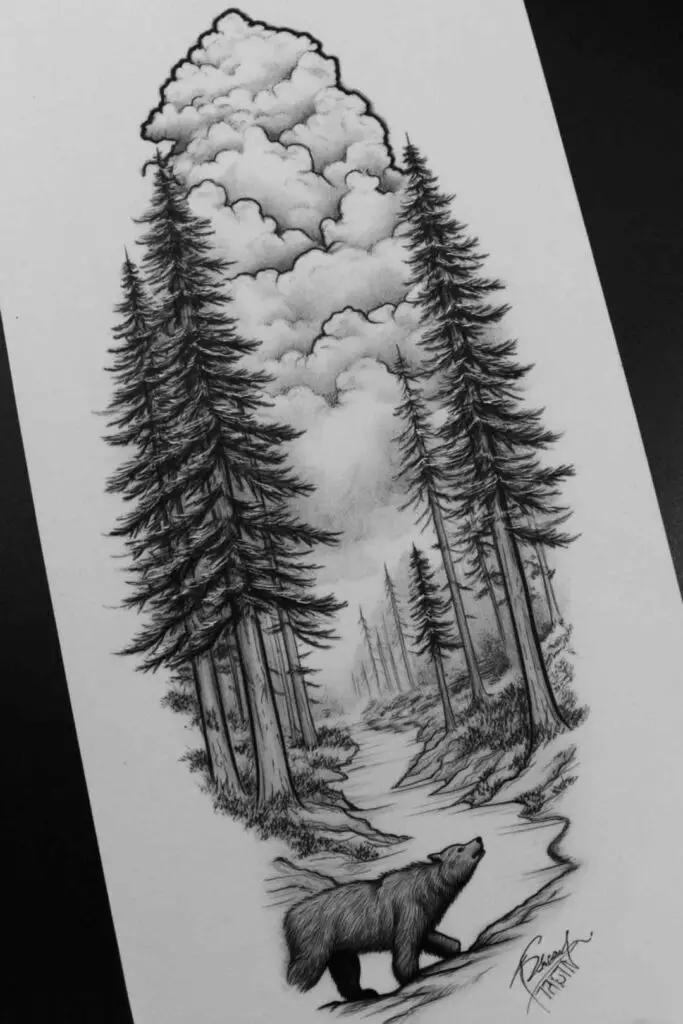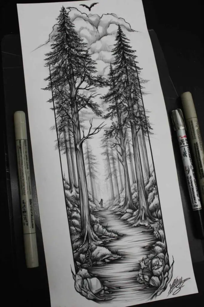 A forest scene half sleeve tattoo featuring tall trees, mist, and a hidden wolf silhouette creates a mysterious and atmospheric design. The towering trees stretch upward with detailed bark texture and sprawling branches, establishing a dense woodland setting.