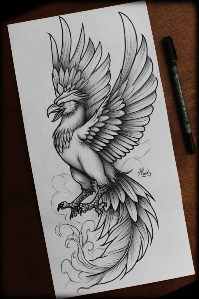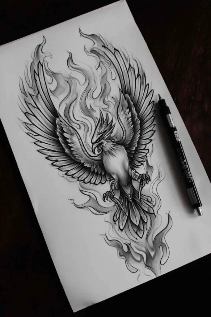 The ashes beneath symbolize endings and renewal, grounding the design in a story of overcoming adversity. Careful shading and color gradients bring depth and heat to the fiery plumage, while dynamic lines convey the phoenix’s vigor and movement as it ascends.