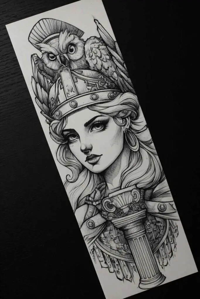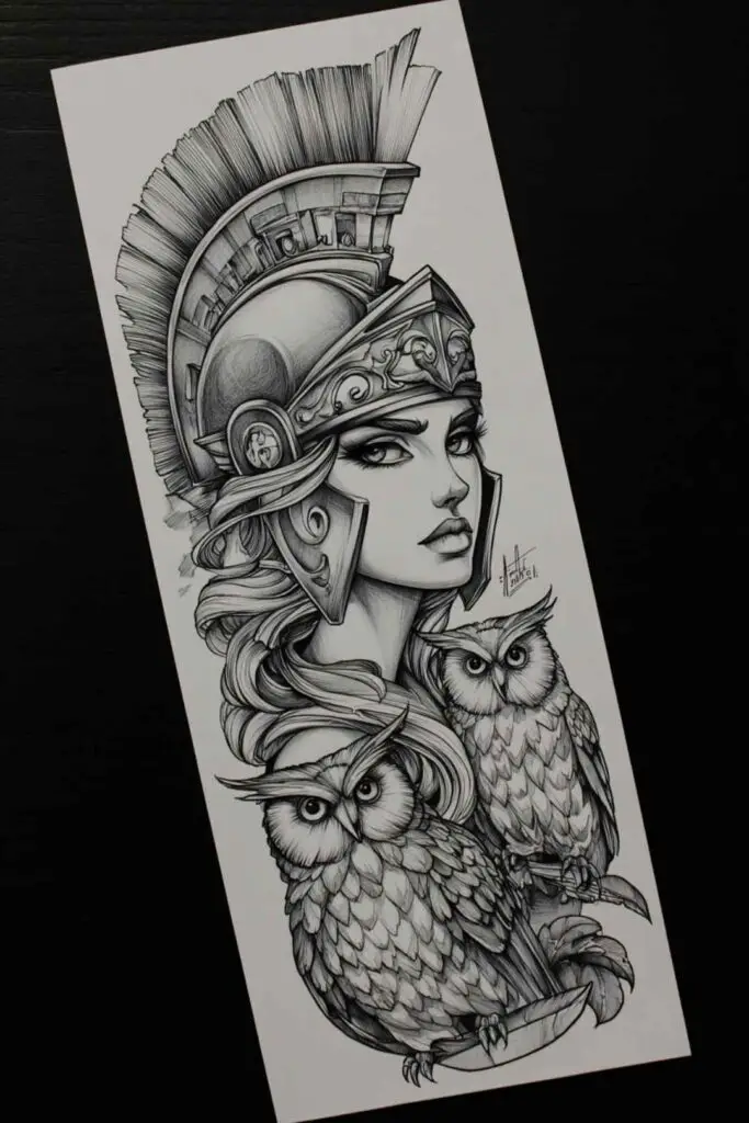 The composition balances fine line work and shading to highlight both the divine and warrior aspects of Athena, while the owls and armor elements wrap naturally around the arm, evoking the timeless spirit of Greek mythology in a striking and cohesive artistic statement.