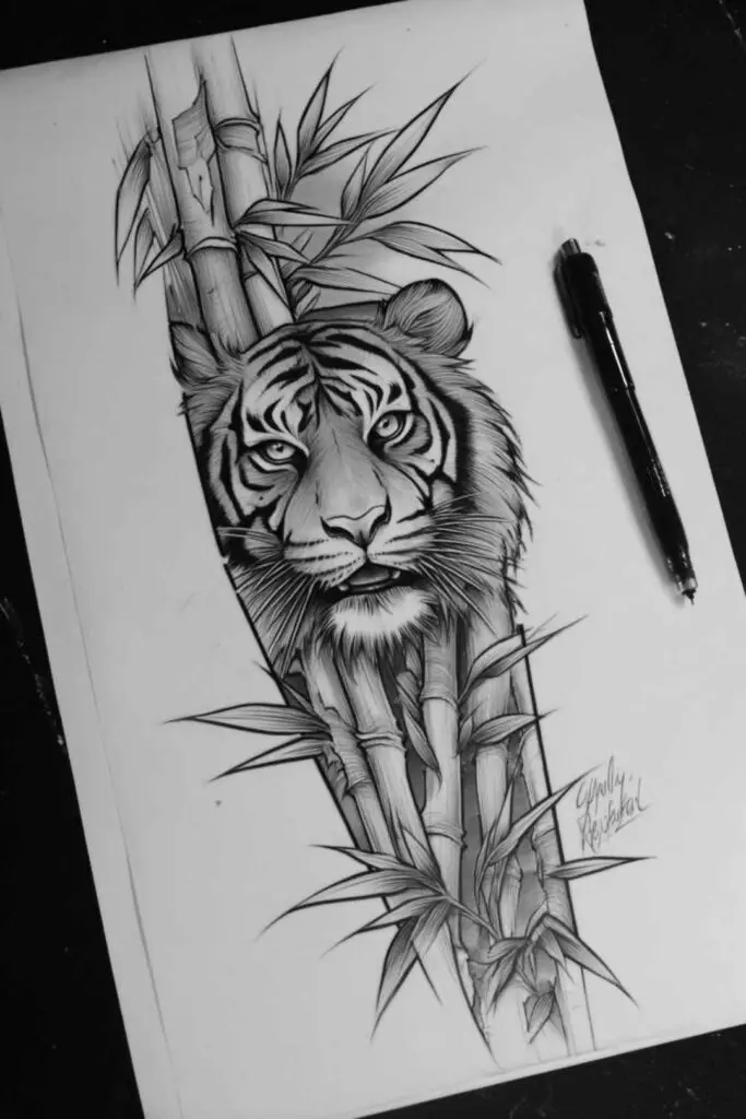 Surrounding the tiger, broken brush strokes add a dynamic, painterly effect, creating movement and texture while contrasting with the natural elements. The bamboo stalks, tall and slender, provide a vertical rhythm that complements the tiger’s form.