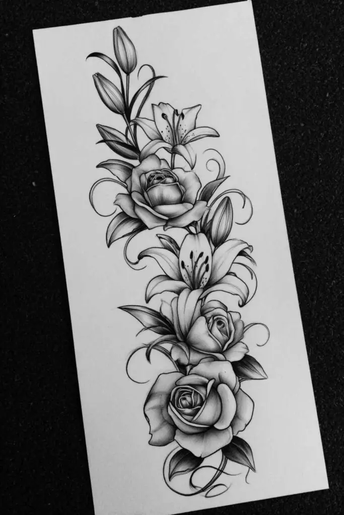 Drawing this design requires careful attention to detail in petal structure and shading to capture the softness and curves of each flower, making the tattoo feel alive and dynamic while fitting seamlessly around the arm’s natural contours.
