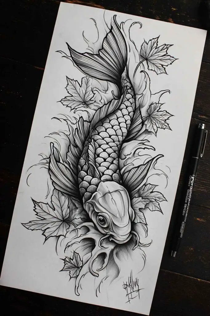 Maple leaves gently drift through the composition, adding a touch of seasonal beauty and subtle color variation. This traditional design requires careful layering and shading to balance its elements, ensuring the flow of water, fish, and foliage work together to wrap naturally around the arm’s shape.