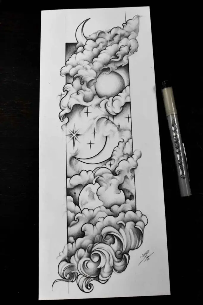 A celestial half sleeve tattoo featuring moons, stars, and swirling nebula clouds creates a dreamy, otherworldly design that invites wonder and introspection. The phases of the moon are illustrated with delicate shading, capturing their luminous glow and symbolizing cycles and transformation.