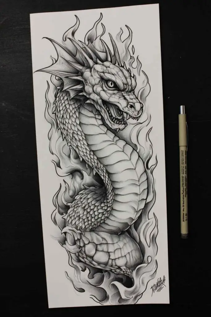 This design demands careful attention to shading and contrast to highlight the dragon’s muscular form and the glowing heat of the flames, resulting in a captivating and fierce piece of body art.