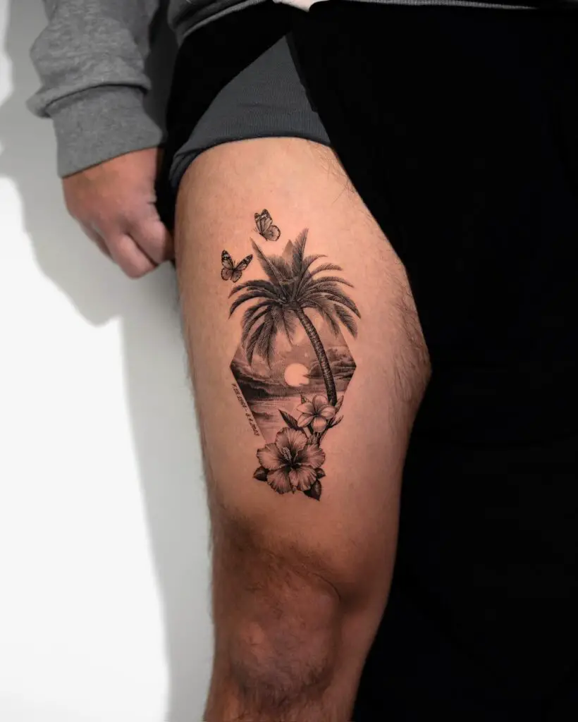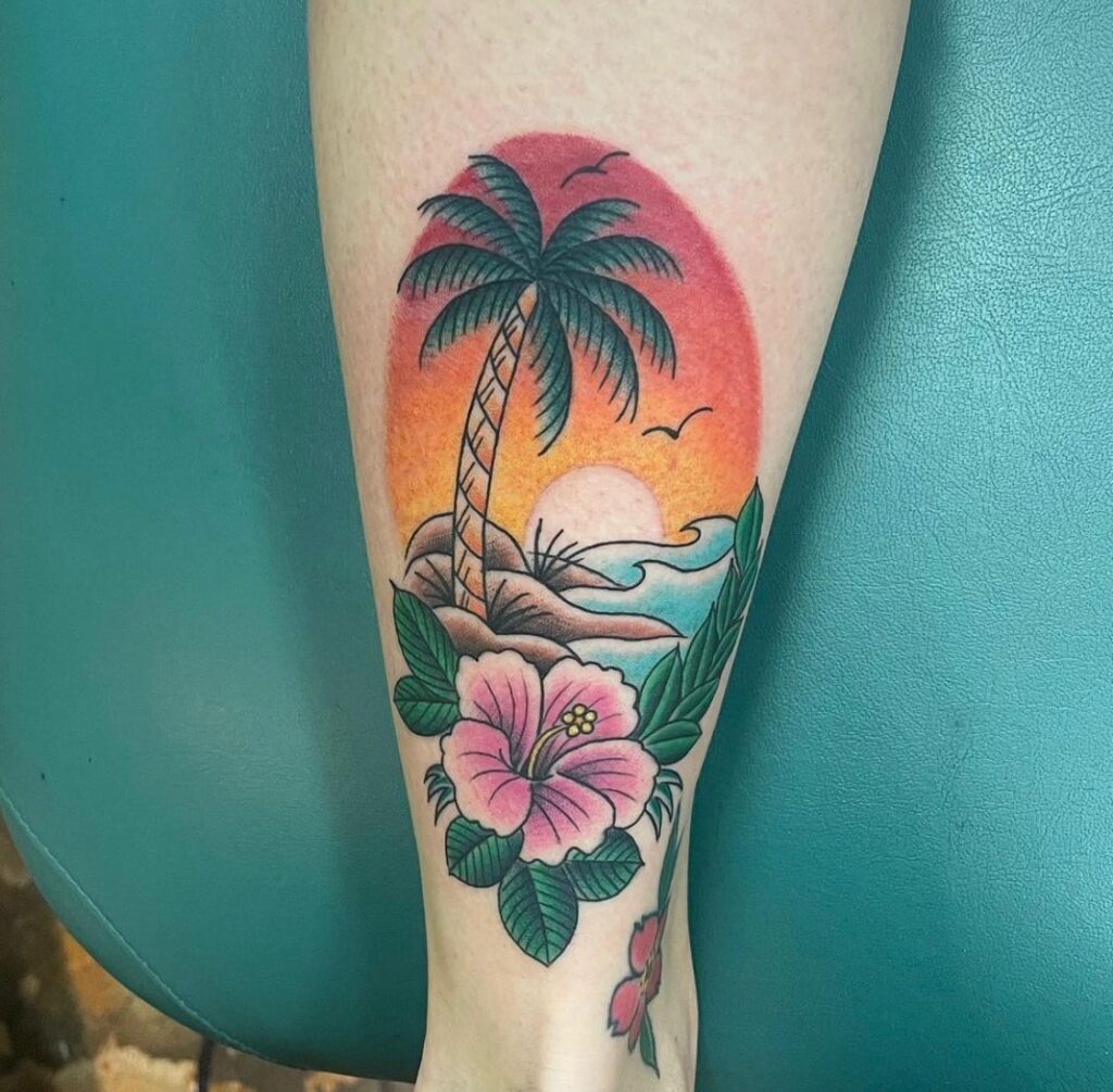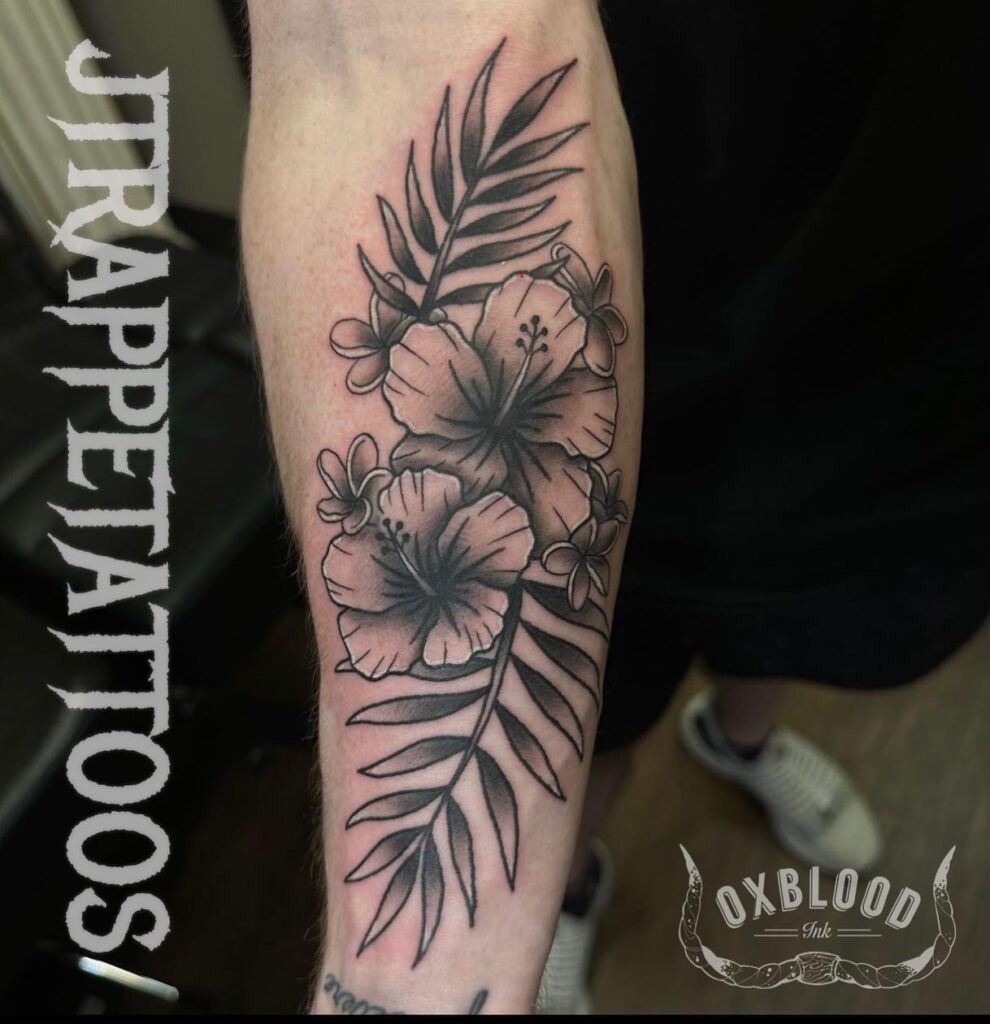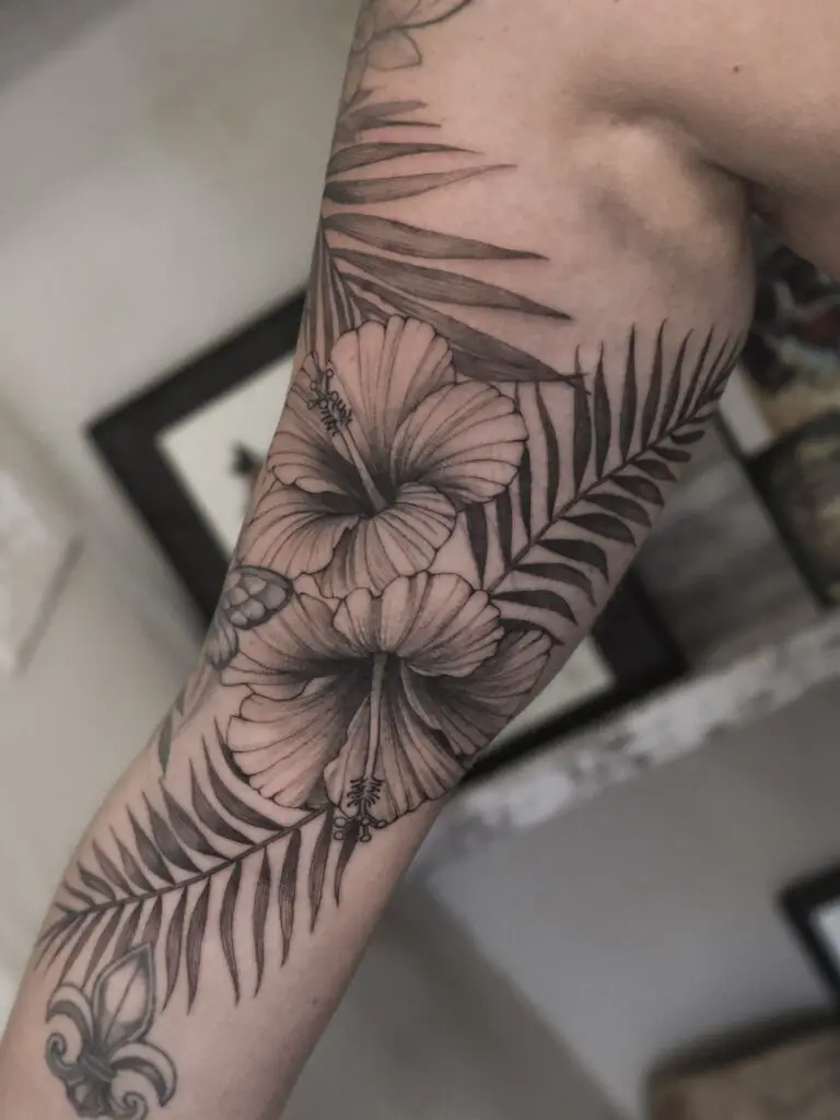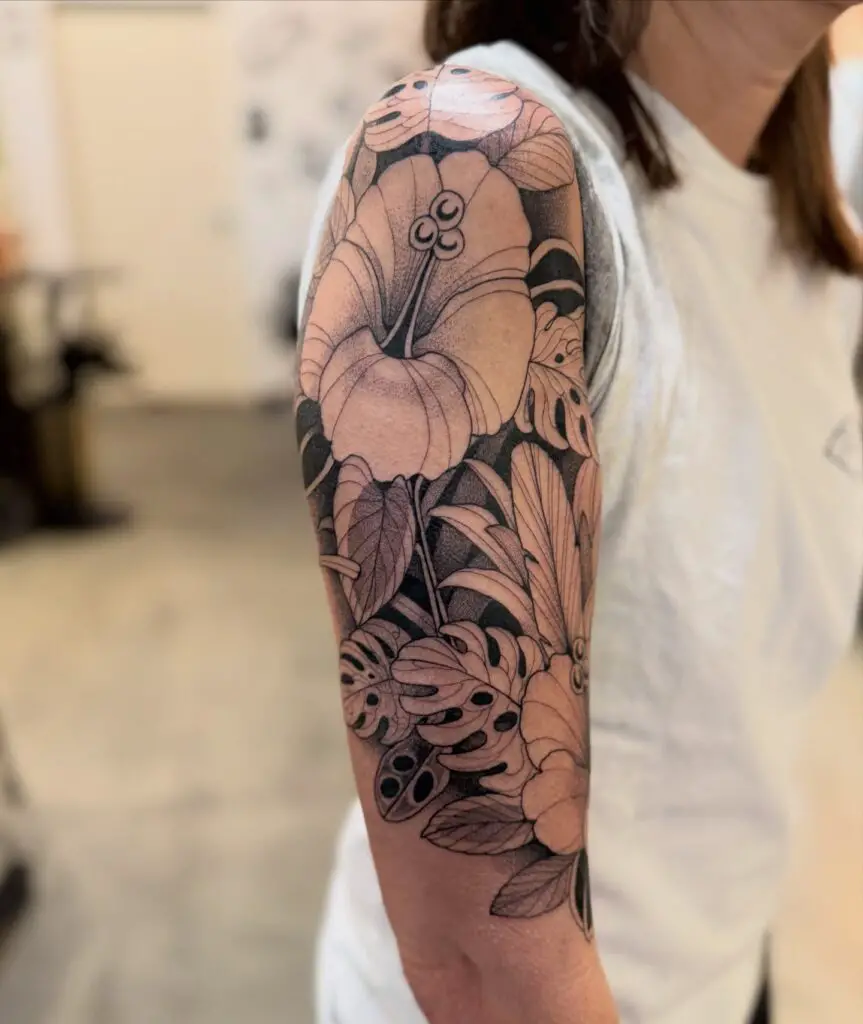 Hibiscus flowers building through a half or full sleeve alongside other tropical elements: palm leaves, monstera, plumeria, and tropical birds. The tropical sleeve creates an environment of heat and colour that suits both men and women. The hibiscus as the dominant floral element among a broader tropical composition.