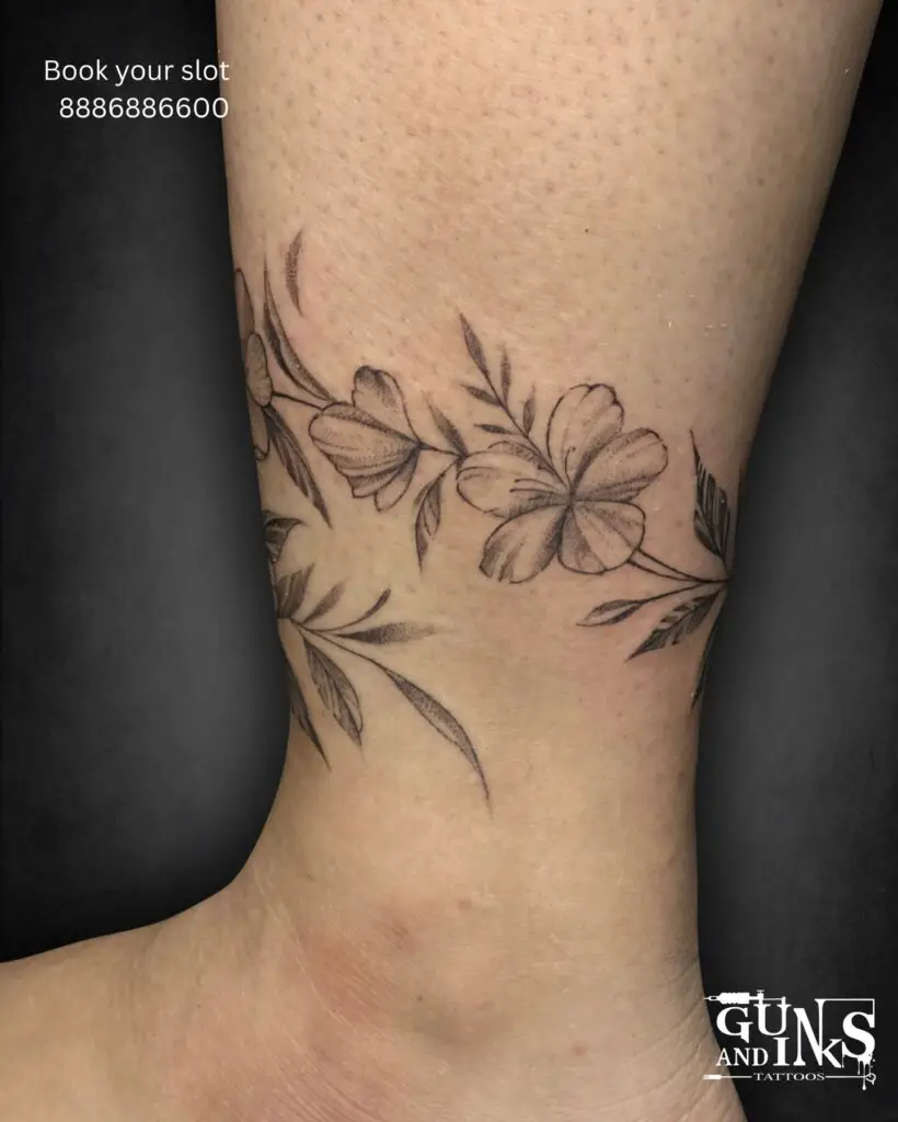 Hibiscus blooms and leaves encircling the ankle in a botanical bracelet format. The ankle bracelet placement suits the hibiscus’s compact but bold form. Multiple small blooms connected by stems and leaves create a continuous botanical band.