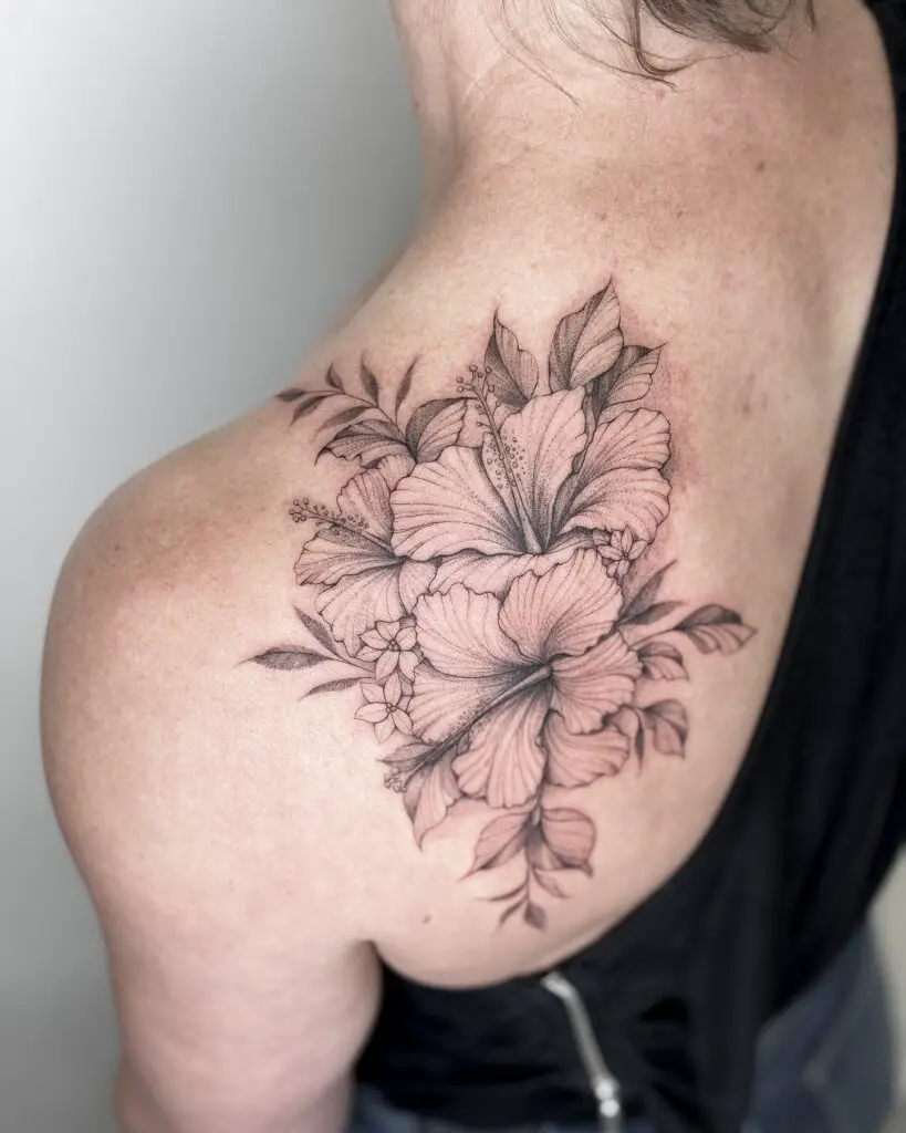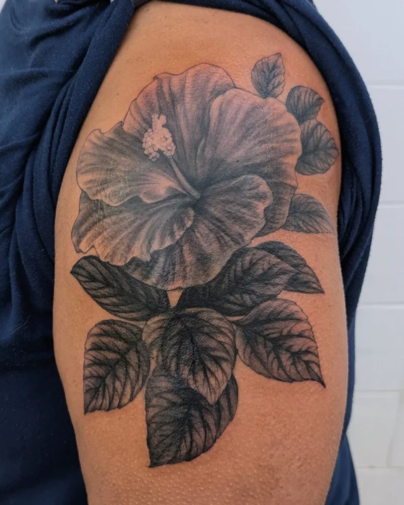 A hibiscus bloom sitting on the shoulder, petals extending down the upper arm and up toward the neck. The shoulder placement gives the hibiscus a natural three-dimensional quality as the petals follow the shoulder’s curve. One large bloom at this scale can be a complete and powerful piece.