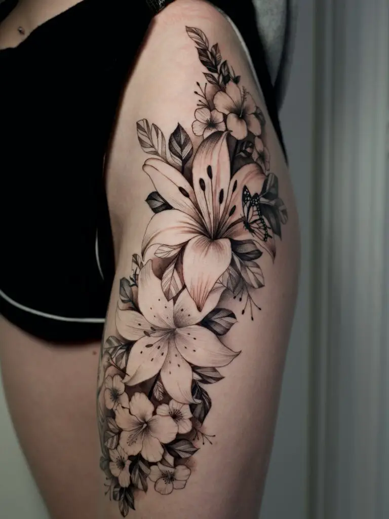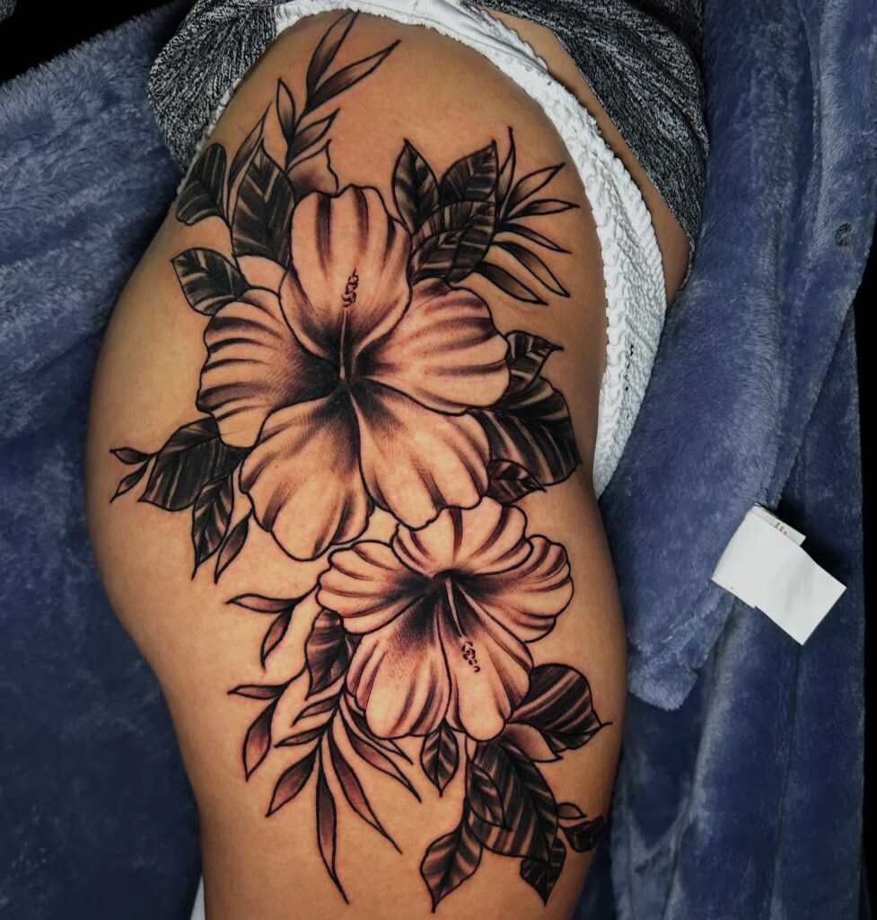 One or several large hibiscus blooms on the thigh. The thigh’s broad surface allows the hibiscus to be rendered at a scale where the petals’ natural texture and venation can be shown with real detail. A thigh hibiscus in rich colour realism is one of the most visually striking floral placements available.