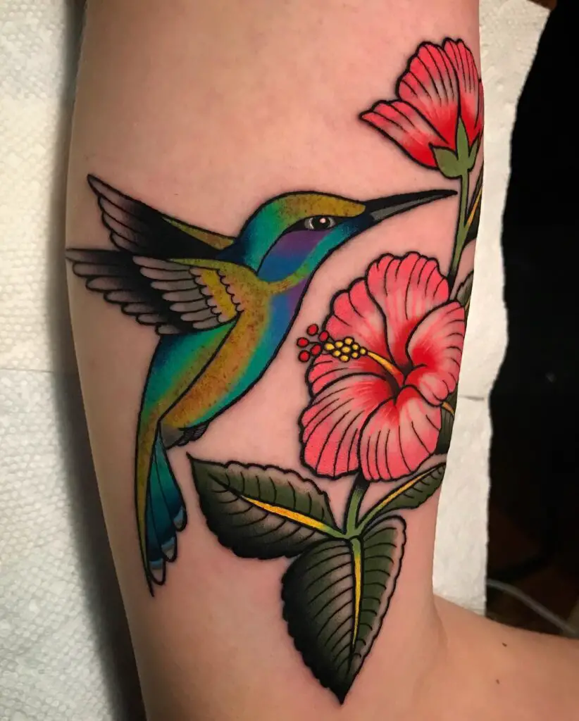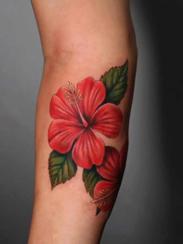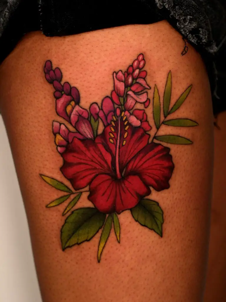 The hibiscus is one of the most colour-dependent subjects in floral tattooing: the flower’s tropical associations depend significantly on its warm, saturated palette. If you want a hibiscus tattoo that carries the full tropical warmth of the subject, choose an artist whose healed colour floral work shows maintained saturation in reds, pinks, and oranges. These warm tones require careful technique to hold properly. Artists who specialise in tropical floral work will have portfolios that demonstrate exactly this.