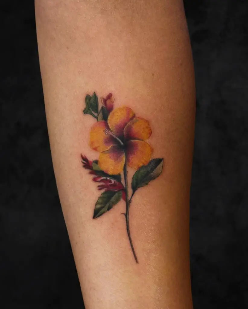 The pua aloalo, Hawaii’s official state flower, in its characteristic yellow with a red centre. The yellow hibiscus is less commonly tattooed than the red version, which makes it a more specific and personally meaningful choice for those with specific Hawaiian connection.