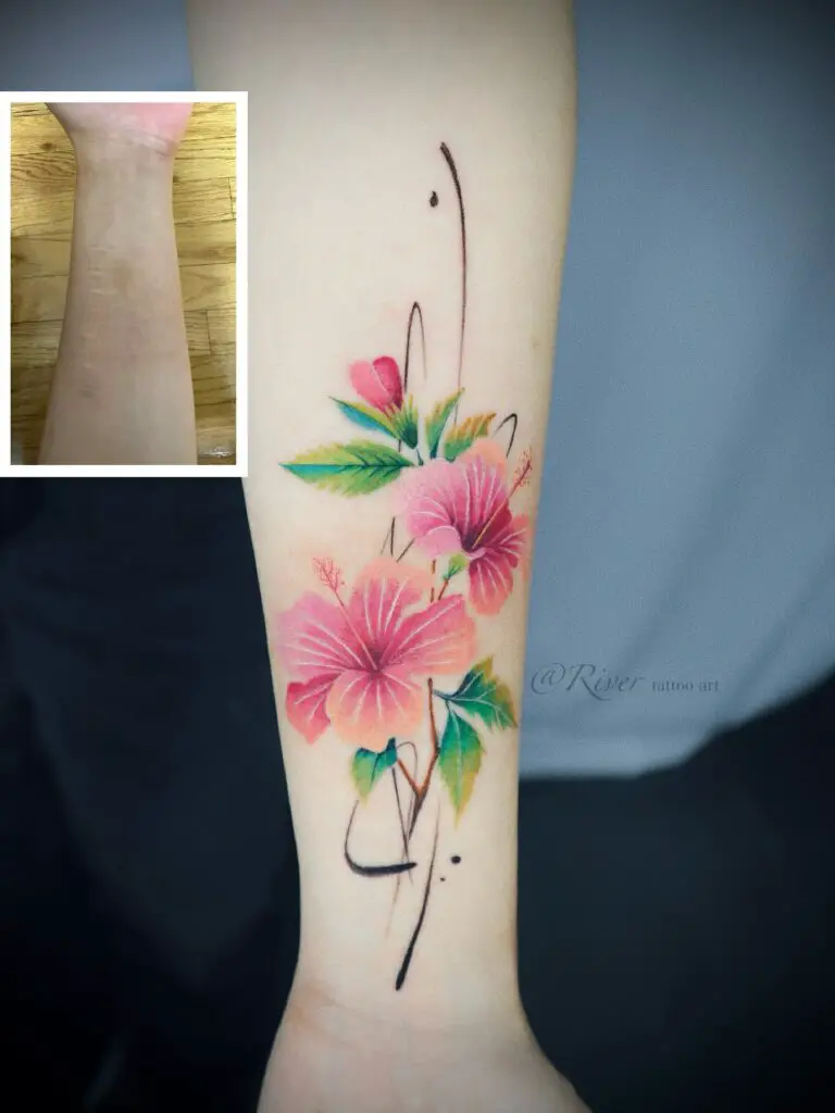A hibiscus in watercolour technique, the petals in bleeding washes of pink, red, or coral. The watercolour approach creates a hibiscus that looks painted in the wet medium, the colour spreading beyond the petal edges. The tropical warmth of the hibiscus suits the soft luminous quality of watercolour tattooing.