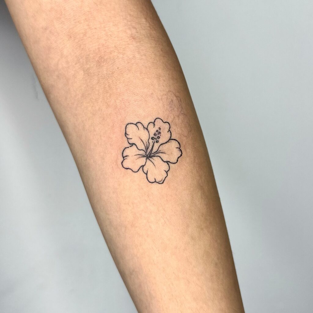 A hibiscus in clean outline with no fill: just the defining lines of the five petals and the stamen. The minimalist hibiscus works at small scales on the wrist, collarbone, or ankle. The flower’s bold form is recognisable even in minimal treatment, the outline sufficient to convey the subject.