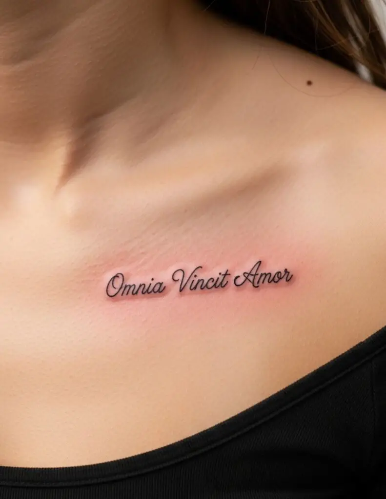 “Love conquers all.” From Virgil’s Eclogues. One of the oldest statements of love’s supremacy. The full line continues with “et nos cedamus amori” — let us too yield to love. For a love tattoo with classical roots.